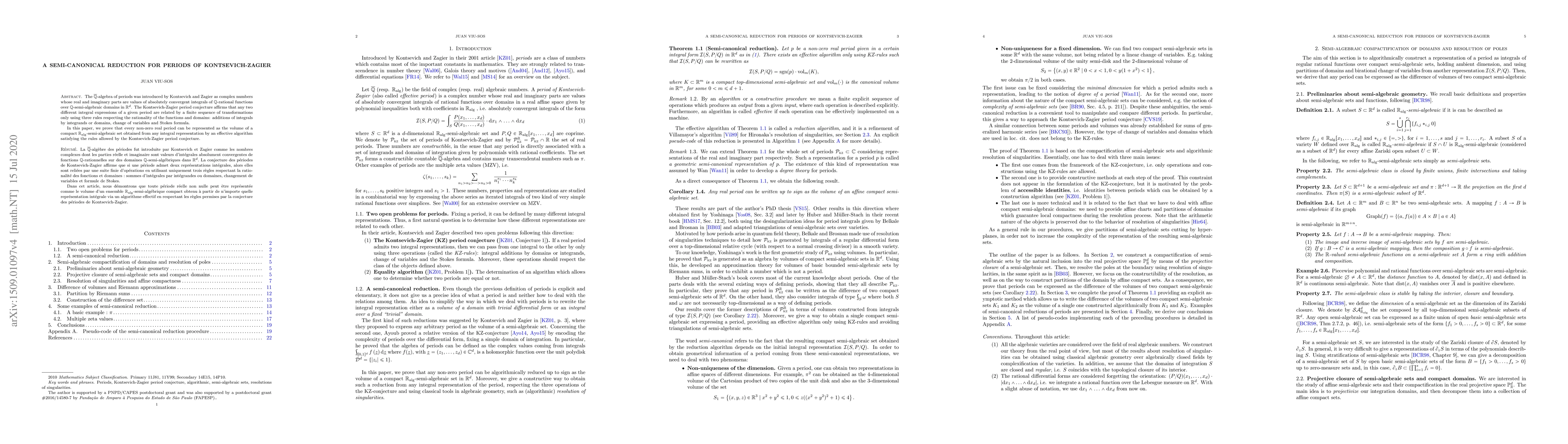 This paper proves a semi-canonical reduction for periods of Kontsevich-Zagier, demonstrating that any non-zero real period can be represented as the volume of a compact ${\overline{\mathbb Q}}\cap{\mathbb R}$-semi-algebraic set through an effective algorithm adhering to the transformations allowed by the Kontsevich-Zagier period conjecture.