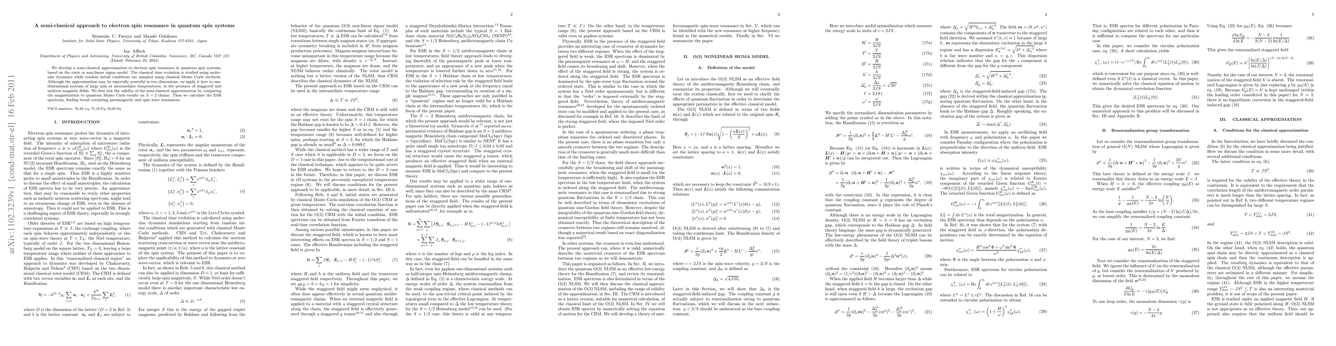 This paper develops a semi-classical approximation for electron spin resonance in quantum spin systems using a rotor model and classical molecular dynamics. It tests the approach's validity against quantum Monte Carlo results and finds broad coexisting resonances in ESR spectra for one-dimensional systems.