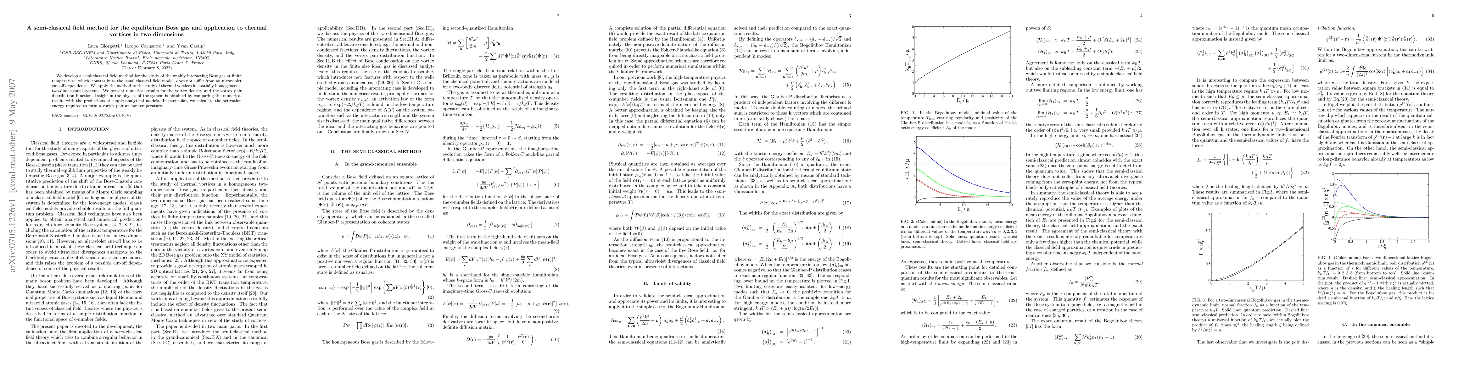 This paper introduces a semi-classical field method for analyzing the equilibrium Bose gas at finite temperature, free from ultraviolet cut-off dependence. The method is applied to study thermal vortices in two-dimensional systems, yielding numerical results for vortex density and pair distribution, and comparing these findings with analytical models to determine the activation energy for vortex pair formation.