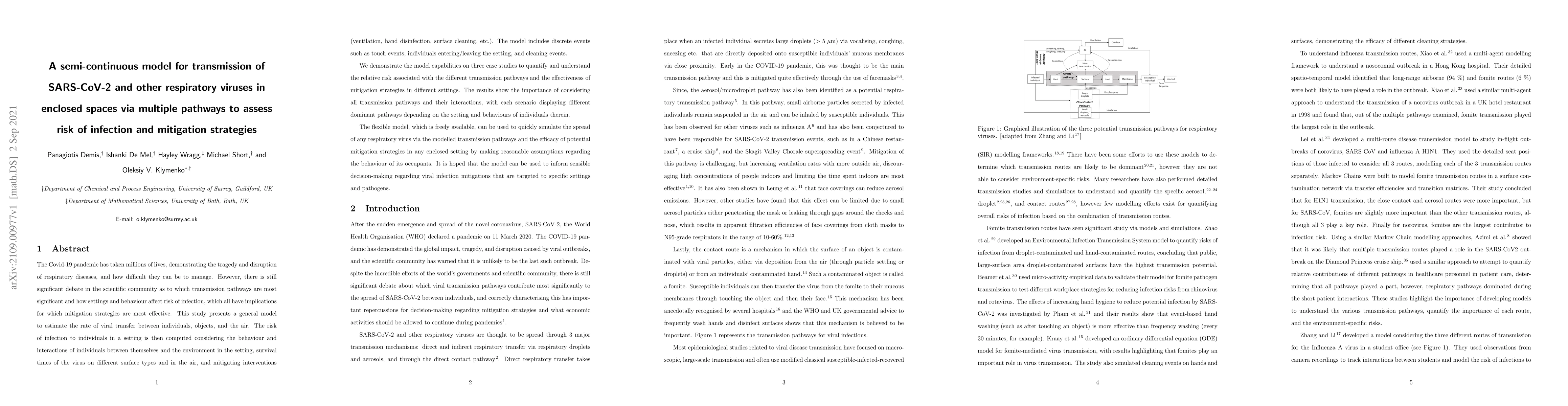 This paper introduces a semi-continuous model to estimate SARS-CoV-2 transmission in enclosed spaces via multiple pathways, assessing infection risk and mitigation strategies. The model evaluates the impact of behaviors, environmental factors, and interventions, demonstrating its application through three case studies to highlight the varying dominant transmission pathways in different settings.