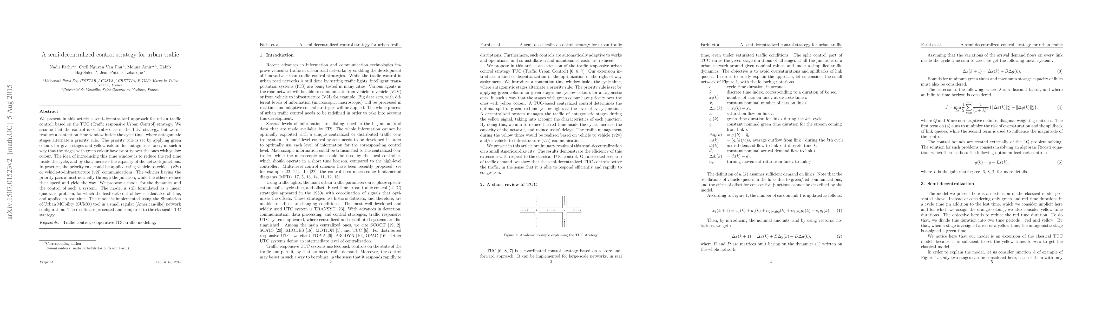 We present in this article a semi-decentralized approach for urban traffic control, based on the TUC (Traffic responsive Urban Control) strategy. We assume that the control is centralized as in the TUC strategy, but we introduce a contention time window inside the cycle time, where antagonistic stages alternate a priority rule. The priority rule is set by applying green colours for given stages and yellow colours for antagonistic ones, in such a way that the stages with green colour have priority over the ones with yellow colour. The idea of introducing this time window is to reduce the red time inside the cycle, and by that, increase the capacity of the network junctions. In practice, the priority rule could be applied using vehicle-to-vehicle (v2v) or vehicle-to-infrastructure (v2i) communications. The vehicles having the priority pass almost normally through the junction, while the others reduce their speed and yield the way. We propose a model for the dynamics and the control of such a system. The model is still formulated as a linear quadratic problem, for which the feedback control law is calculated off-line, and applied in real time. The model is implemented using the Simulation of Urban MObility (SUMO) tool in a small regular (American-like) network configuration. The results are presented and compared to the classical TUC strategy.