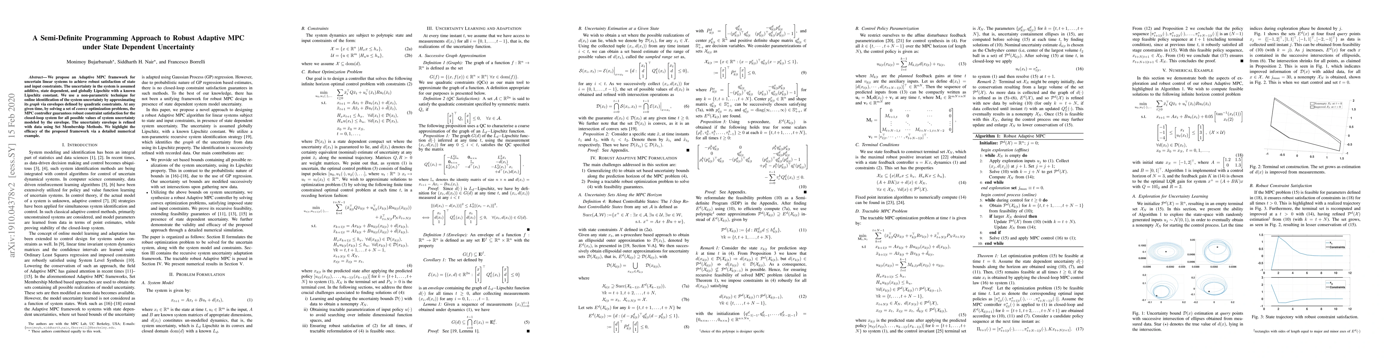 This paper proposes an Adaptive Model Predictive Control (MPC) framework for uncertain linear systems that guarantees robust satisfaction of state and input constraints under state-dependent additive uncertainty. The approach uses semi-definite programming and online identification techniques to refine uncertainty envelopes, ensuring constraint satisfaction through convex optimization problems.