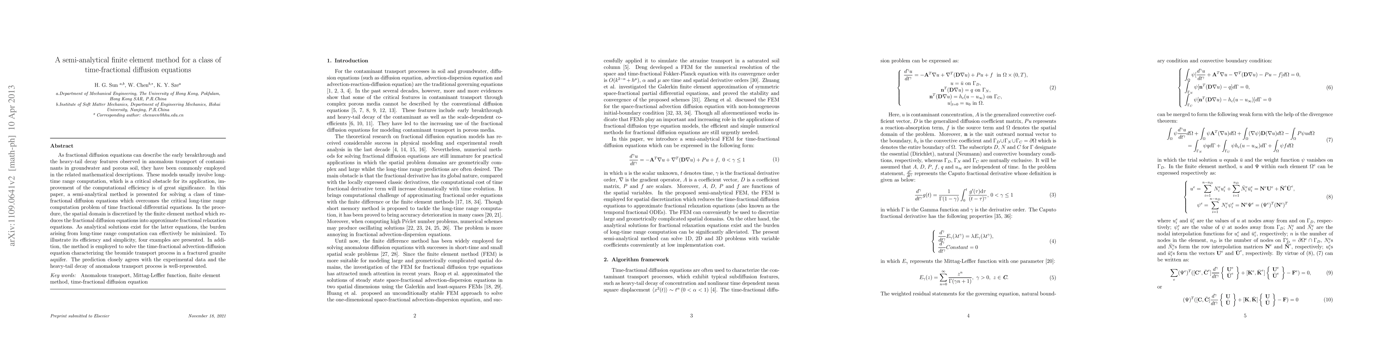 As fractional diffusion equations can describe the early breakthrough and the heavy-tail decay features observed in anomalous transport of contaminants in groundwater and porous soil, they have been commonly employed in the related mathematical descriptions. These models usually involve long-time range computation, which is a critical obstacle for its application, improvement of the computational efficiency is of great significance. In this paper, a semi-analytical method is presented for solving a class of time-fractional diffusion equations which overcomes the critical long-time range computation problem of time fractional differential equations. In the procedure, the spatial domain is discretized by the finite element method which reduces the fractional diffusion equations into approximate fractional relaxation equations. As analytical solutions exist for the latter equations, the burden arising from long-time range computation can effectively be minimized. To illustrate its efficiency and simplicity, four examples are presented. In addition, the method is employed to solve the time-fractional advection-diffusion equation characterizing the bromide transport process in a fractured granite aquifer. The prediction closely agrees with the experimental data and the heavy-tail decay of anomalous transport process is well-represented.