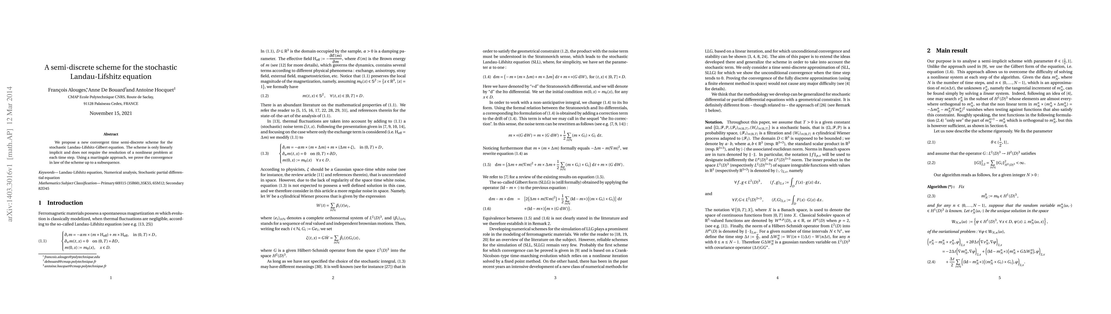This paper introduces a linearly implicit, time semi-discrete scheme for solving the stochastic Landau-Lifshitz-Gilbert equation, which avoids solving nonlinear problems at each step. The authors prove the scheme's convergence in law using a martingale approach.