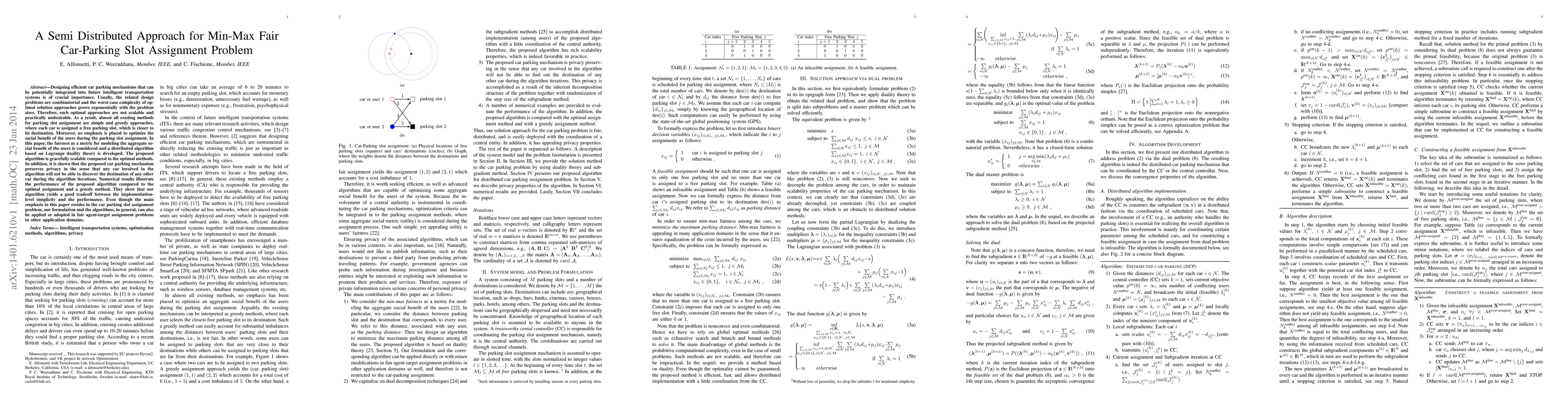 This paper proposes a scalable semi-distributed algorithm for fair car-parking slot assignment based on Lagrange duality, achieving a balance between simplicity and performance while preserving user privacy. The algorithm outperforms both optimal and greedy methods in terms of fairness and scalability.