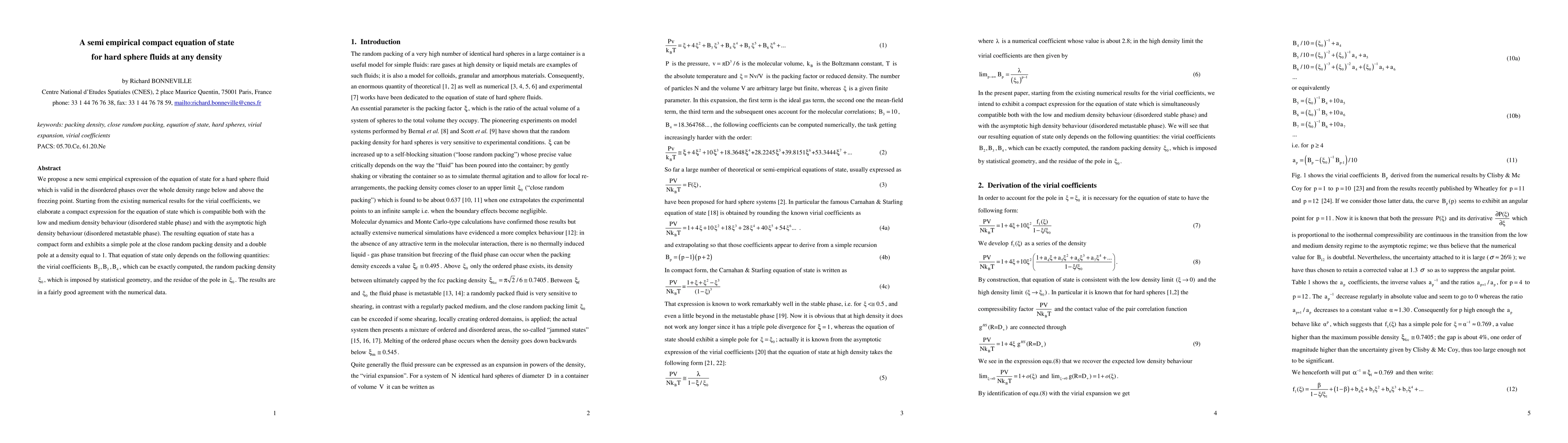This paper proposes a new semi empirical expression for the virial coefficients of hard sphere fluids, providing accurate results over the entire density range and improving upon the Carnahan & Starling equation of state, especially near the close random packing limit. The results align well with numerical data.