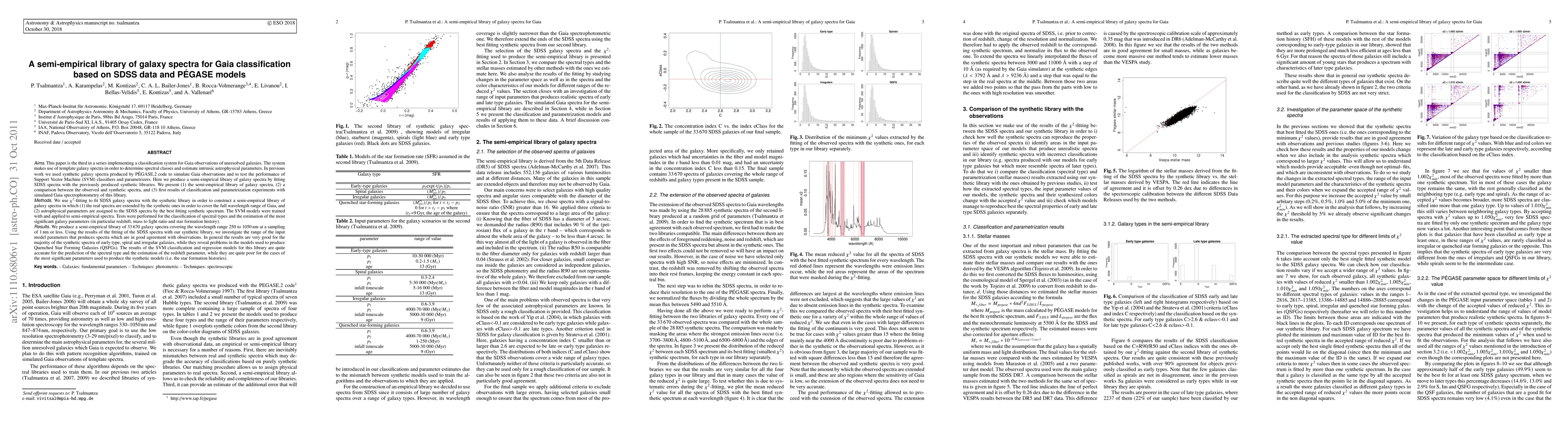 This paper constructs a semi-empirical library of galaxy spectra by fitting SDSS data with synthetic PEGASE.2 models, aiming to classify and estimate parameters for Gaia observations. The library, tested with SVM classifiers, shows promising results in spectral type classification and parameter estimation.
