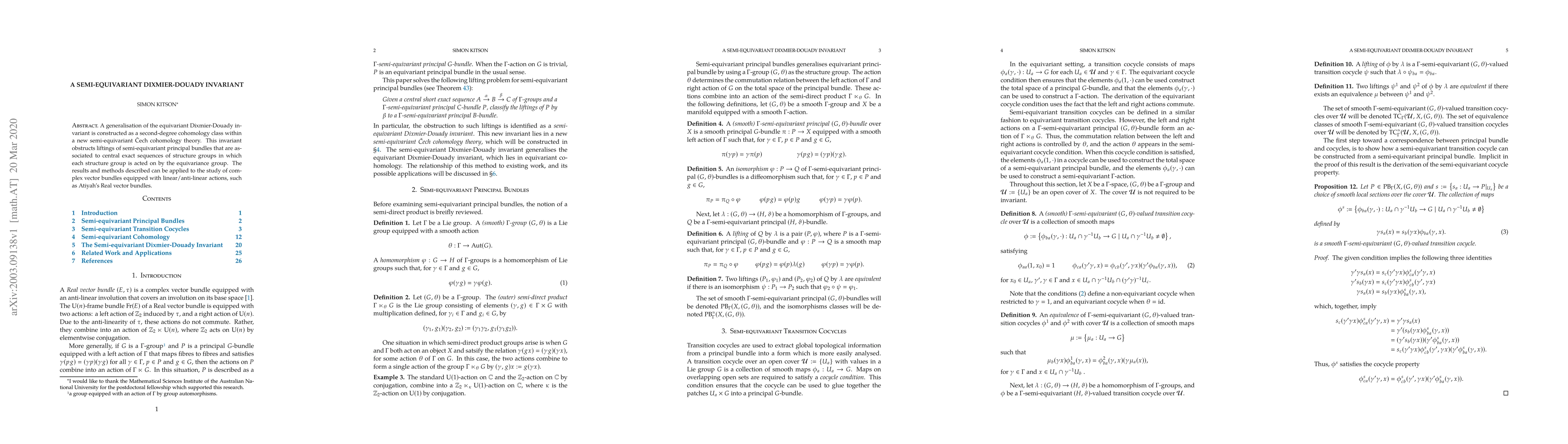 A generalisation of the equivariant Dixmier-Douady invariant is constructed as a second-degree cohomology class within a new semi-equivariant \v{C}ech cohomology theory. This invariant obstructs liftings of semi-equivariant principal bundles that are associated to central exact sequences of structure groups in which each structure group is acted on by the equivariance group. The results and methods described can be applied to the study of complex vector bundles equipped with linear/anti-linear actions, such as Atiyah's Real vector bundles.
