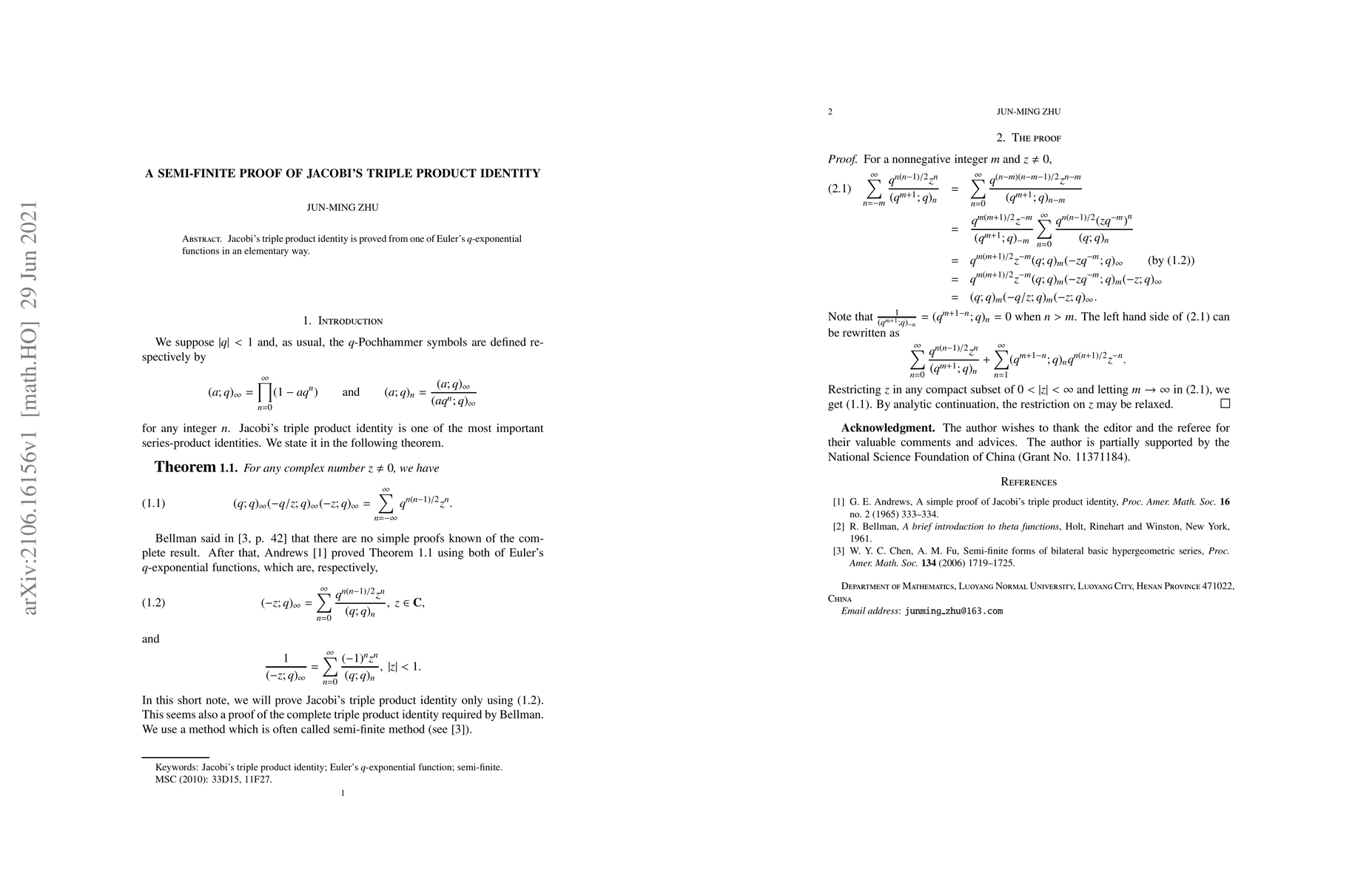Summary: Jacobi's triple product identity is demonstrated using Euler's $q$-exponential function in a straightforward, elementary manner. This proof offers a semi-finite approach to a classic result in mathematical analysis.