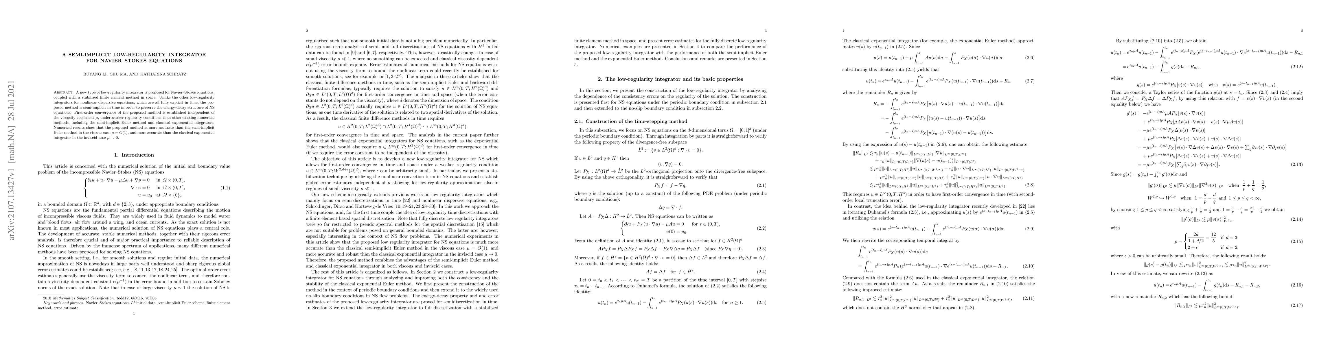 This paper introduces a novel semi-implicit low-regularity integrator for the Navier-Stokes equations, which is coupled with a stabilized finite element method. The method achieves first-order convergence under weaker regularity conditions and outperforms existing semi-implicit and exponential integrators in both viscous and inviscid scenarios.