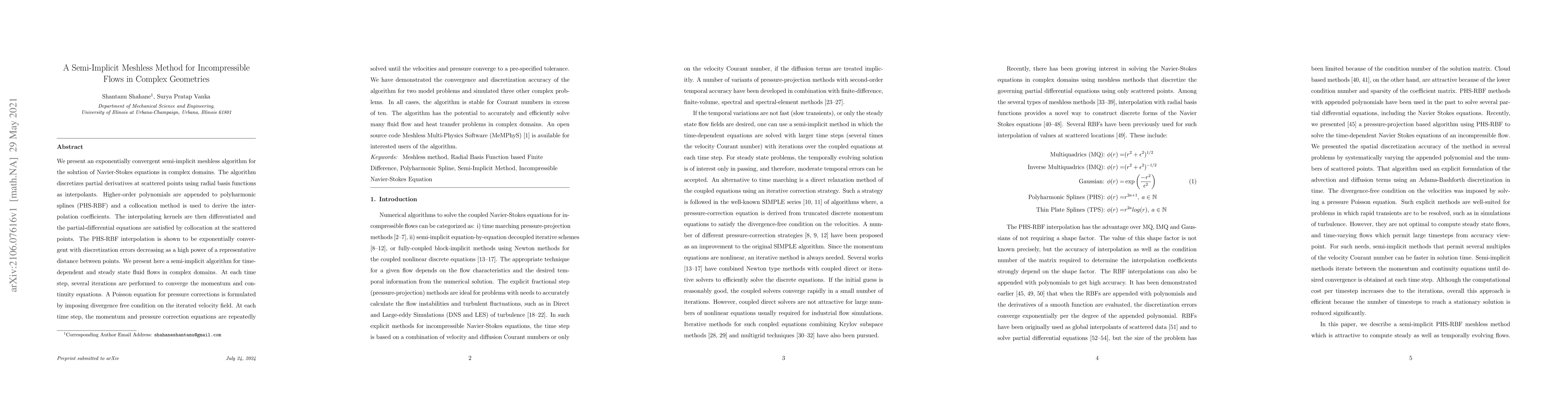 This paper introduces a semi-implicit meshless method using radial basis functions for solving incompressible Navier-Stokes equations in complex geometries, demonstrating exponential convergence and stability for high Courant numbers. An open-source code, MeMPhyS, is available for practical applications.