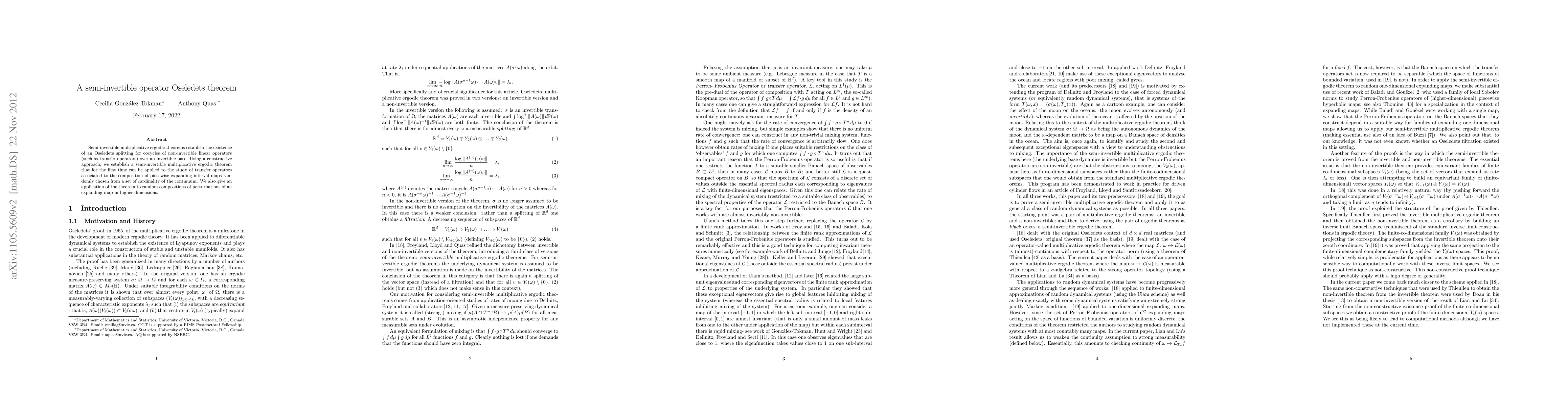 The paper introduces a semi-invertible multiplicative ergodic theorem, demonstrating an Oseledets splitting for non-invertible linear operators over invertible bases, and applies it to study transfer operators for randomly composed piecewise expanding maps.