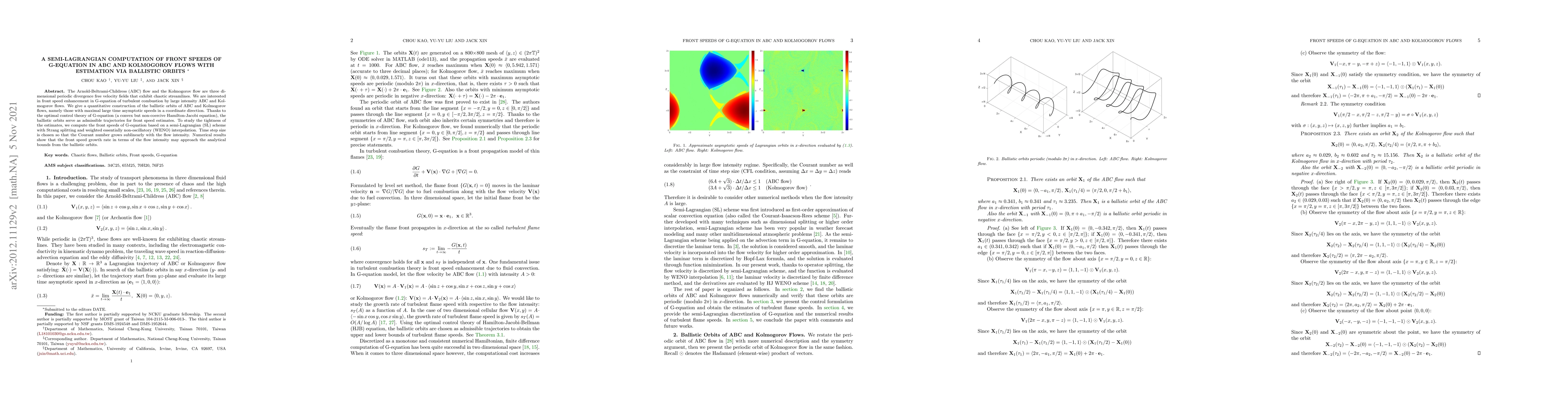 This paper investigates front speed enhancement in turbulent combustion modeled by the G-equation under chaotic ABC and Kolmogorov flows, employing a semi-Lagrangian computation method. It uses ballistic orbits derived from optimal control theory to estimate front speeds and finds that numerical results align with analytical bounds.