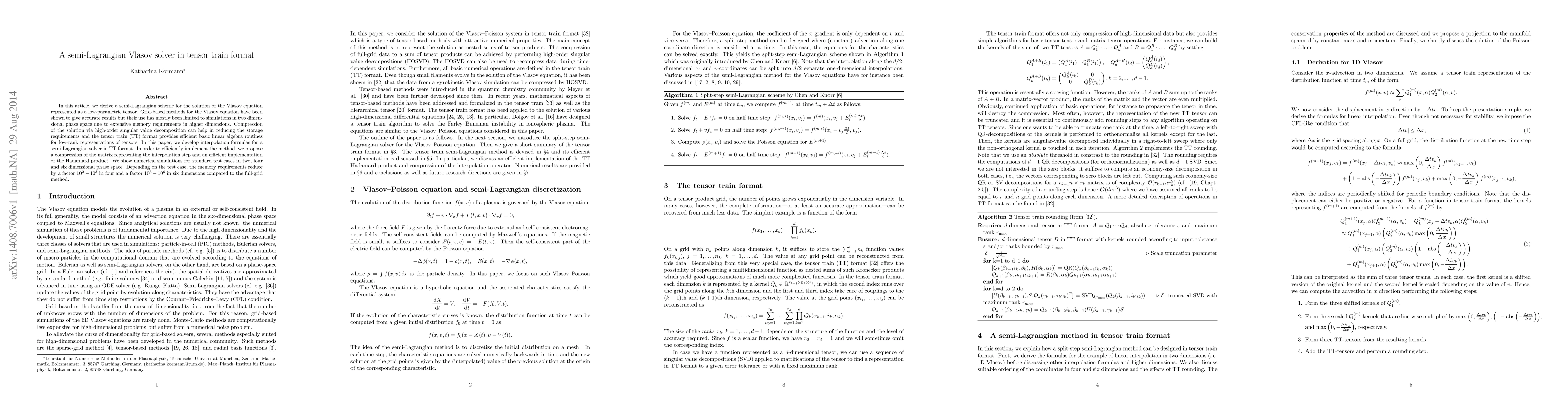 This paper develops a semi-Lagrangian solver for the Vlasov equation in tensor train format, significantly reducing memory requirements compared to grid-based methods, especially in higher-dimensional phase spaces, achieving reductions by factors of $10^2-10^6$. The method employs efficient linear algebra routines and compression techniques for the interpolation step.
