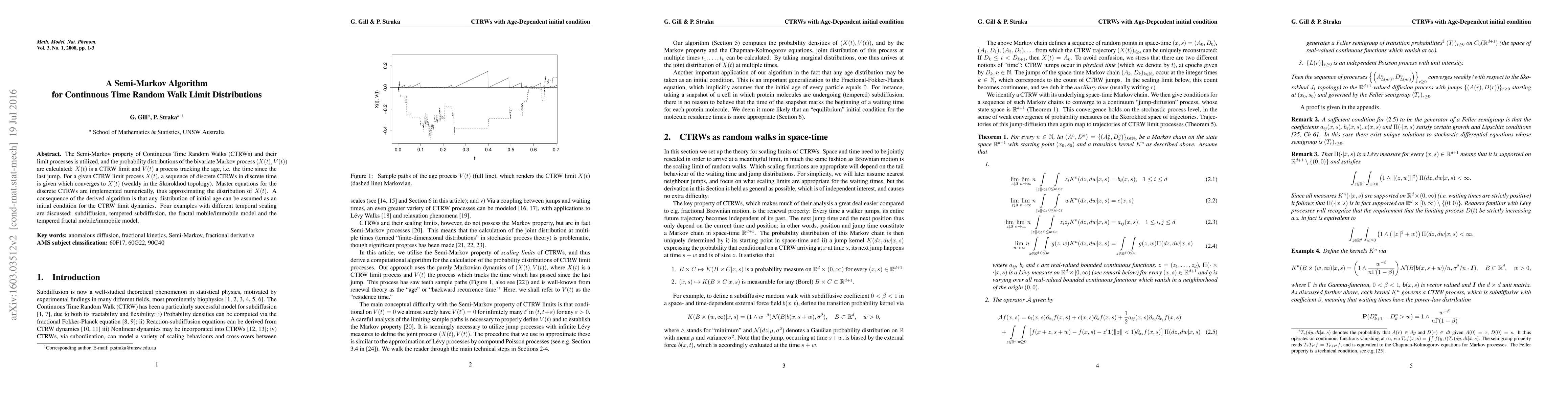This paper develops a Semi-Markov algorithm to approximate the probability distributions of Continuous Time Random Walks (CTRWs) and their limit processes, using a bivariate Markov process. The algorithm allows for different initial age distributions and is applied to four examples showcasing various temporal scaling behaviors.