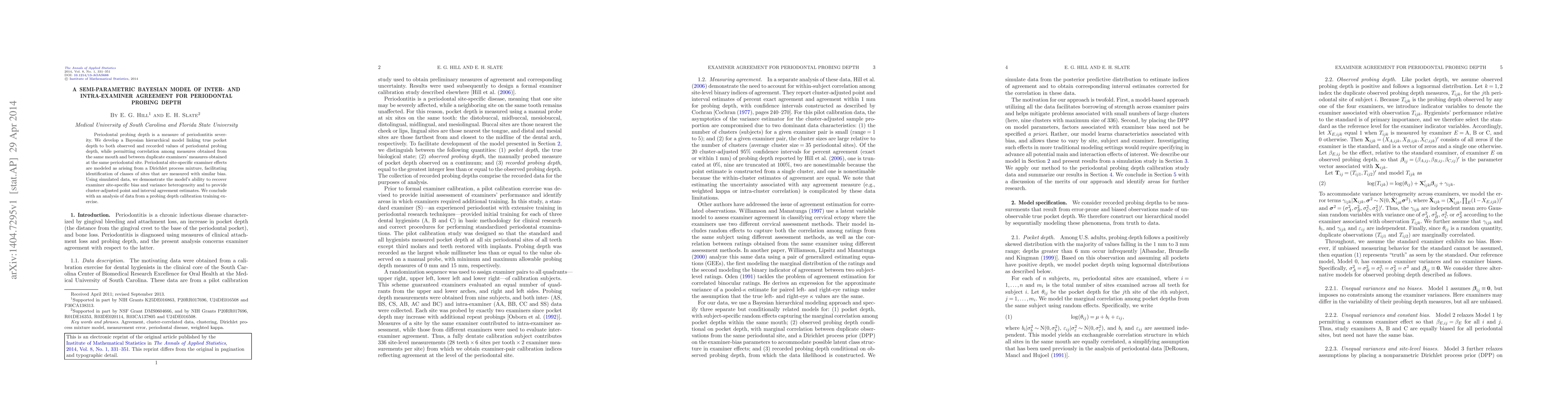 Periodontal probing depth is a measure of periodontitis severity. We develop a Bayesian hierarchical model linking true pocket depth to both observed and recorded values of periodontal probing depth, while permitting correlation among measures obtained from the same mouth and between duplicate examiners' measures obtained at the same periodontal site. Periodontal site-specific examiner effects are modeled as arising from a Dirichlet process mixture, facilitating identification of classes of sites that are measured with similar bias. Using simulated data, we demonstrate the model's ability to recover examiner site-specific bias and variance heterogeneity and to provide cluster-adjusted point and interval agreement estimates. We conclude with an analysis of data from a probing depth calibration training exercise.