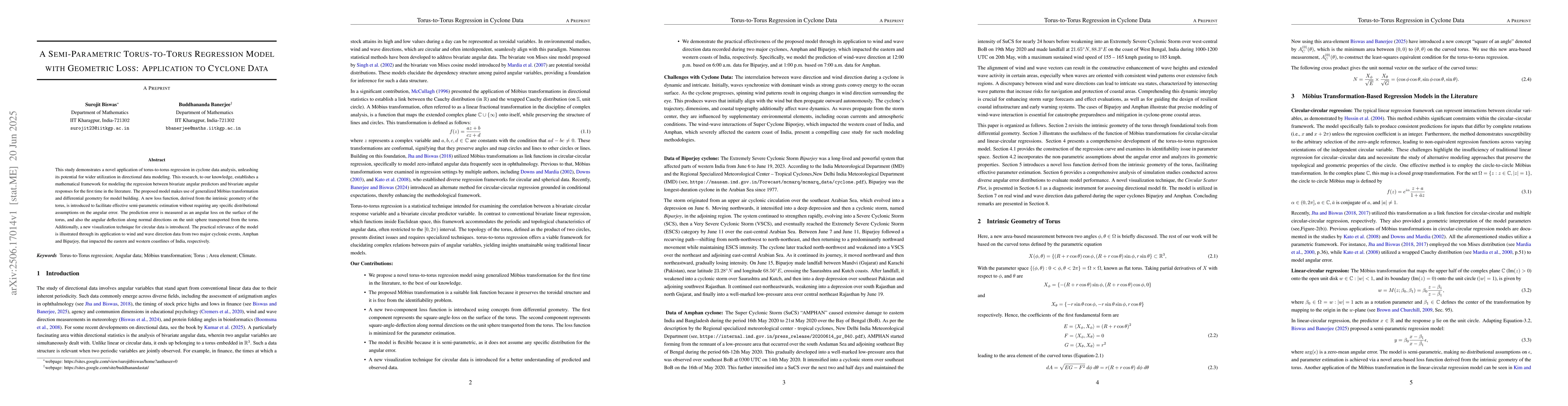 This study demonstrates a novel application of torus-to-torus regression in cyclone data analysis, unleashing its potential for wider utilization in directional data modeling. This research, to our knowledge, establishes a mathematical framework for modeling the regression between bivariate angular predictors and bivariate angular responses for the first time in the literature. The proposed model makes use of generalized M\"{o}bius transformation and differential geometry for model building. A new loss function, derived from the intrinsic geometry of the torus, is introduced to facilitate effective semi-parametric estimation without requiring any specific distributional assumptions on the angular error. The prediction error is measured as an angular loss on the surface of the torus, and also the angular deflection along normal directions on the unit sphere transported from the torus. Additionally, a new visualization technique for circular data is introduced. The practical relevance of the model is illustrated through its application to wind and wave direction data from two major cyclonic events, Amphan and Biparjoy, that impacted the eastern and western coastlines of India, respectively.