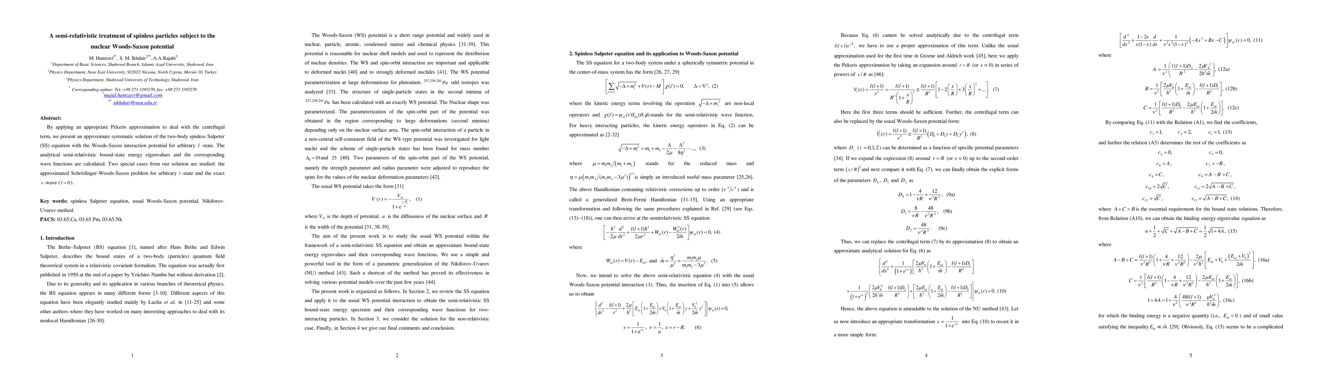 This paper presents a semi-relativistic solution for spinless particles in a Woods-Saxon potential using the Pekeris approximation to handle the centrifugal term. Analytical expressions for the bound-state energy eigenvalues and wave functions are derived, with special focus on the Schrödinger-Woods-Saxon problem and the exact s-wave case.
