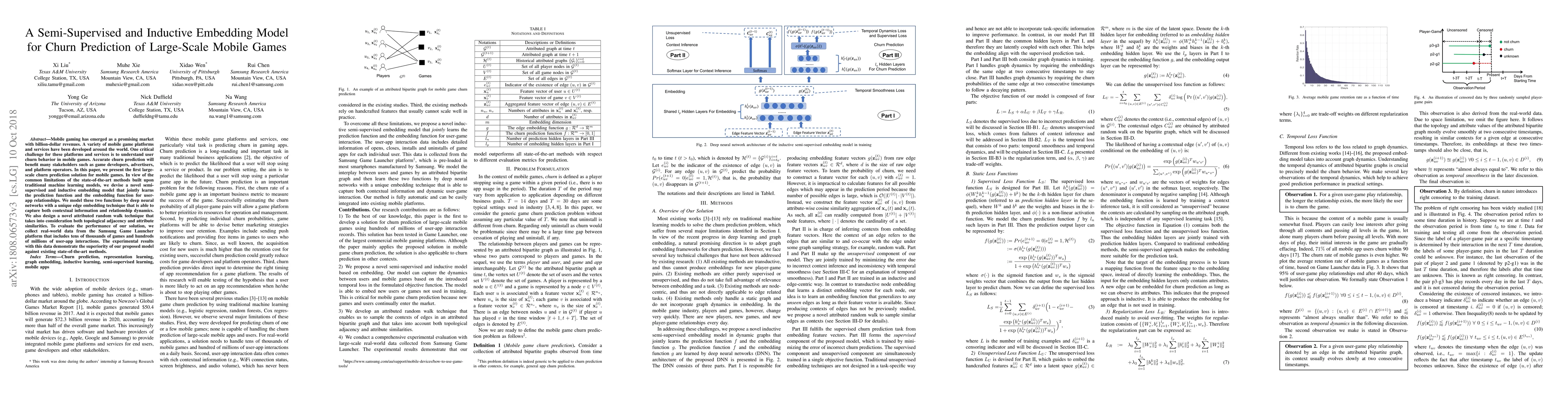 This paper introduces a novel semi-supervised and inductive embedding model for predicting user churn in large-scale mobile games, utilizing deep neural networks and an edge embedding technique to capture contextual information and relationship dynamics. Experimental results on real-world data from the Samsung Game Launcher platform show the model outperforms existing methods.
