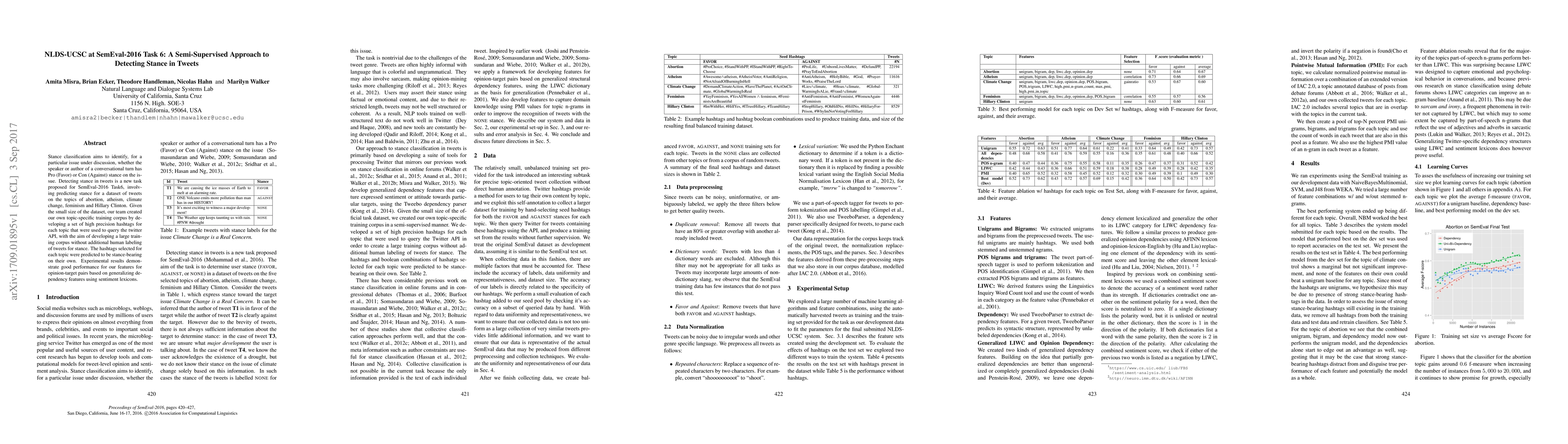 The paper presents a novel method for creating topic-specific training corpora using high-precision hashtags for semi-supervised stance detection in tweets.