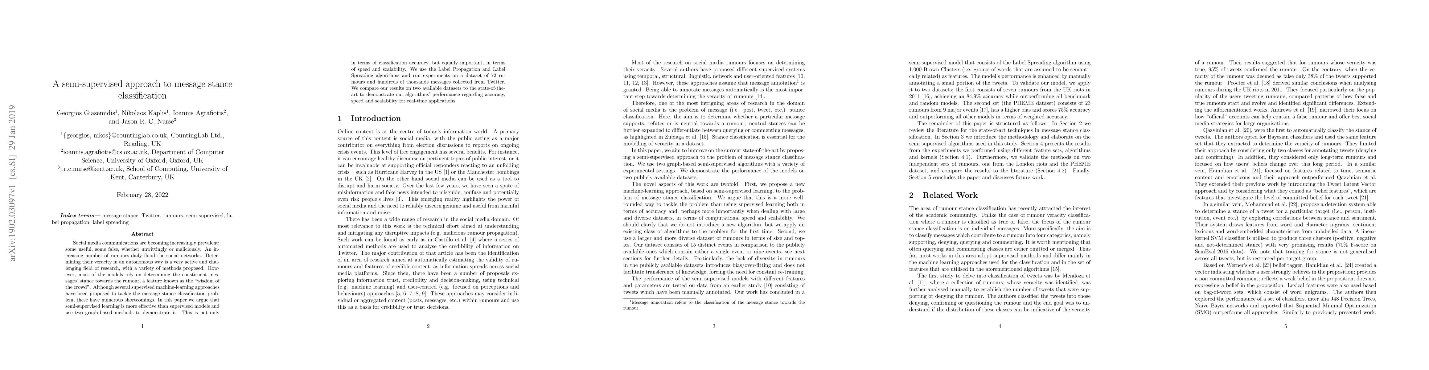 This paper proposes a semi-supervised approach using graph-based methods for classifying message stance towards rumours on social media. The authors demonstrate superior performance in accuracy, speed, and scalability compared to supervised methods using Label Propagation and Label Spreading on Twitter data.