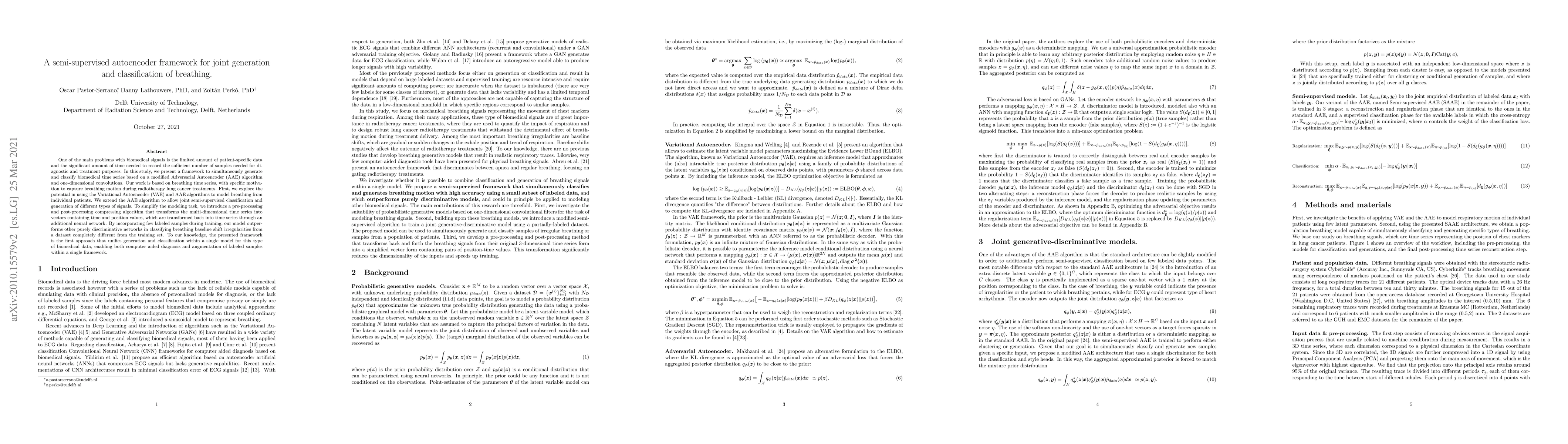 One of the main problems with biomedical signals is the limited amount of patient-specific data and the significant amount of time needed to record the sufficient number of samples needed for diagnostic and treatment purposes. In this study, we present a framework to simultaneously generate and classify biomedical time series based on a modified Adversarial Autoencoder (AAE) algorithm and one-dimensional convolutions. Our work is based on breathing time series, with specific motivation to capture breathing motion during radiotherapy lung cancer treatments. First, we explore the potential in using the Variational Autoencoder (VAE) and AAE algorithms to model breathing from individual patients. We extend the AAE algorithm to allow joint semi-supervised classification and generation of different types of signals. To simplify the modeling task, we introduce a pre-processing and post-processing compressing algorithm that transforms the multi-dimensional time series into vectors containing time and position values, which are transformed back into time series through an additional neural network. By incorporating few labeled samples during training, our model outperforms other purely discriminative networks in classifying breathing baseline shift irregularities from a dataset completely different from the training set. To our knowledge, the presented framework is the first approach that unifies generation and classification within a single model for this type of biomedical data, enabling both computer aided diagnosis and augmentation of labeled samples within a single framework.