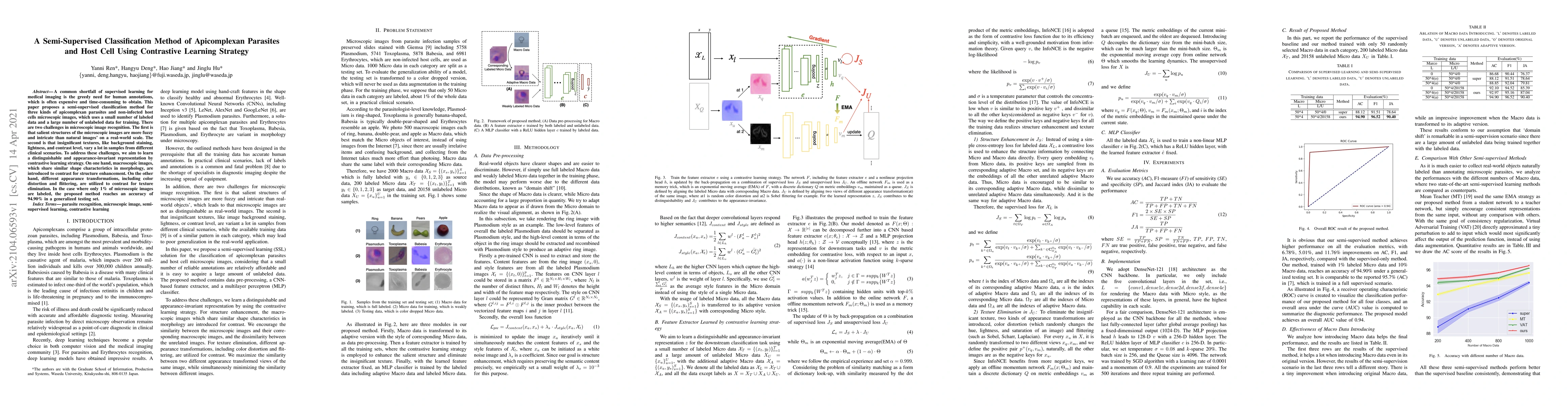 A common shortfall of supervised learning for medical imaging is the greedy need for human annotations, which is often expensive and time-consuming to obtain. This paper proposes a semi-supervised classification method for three kinds of apicomplexan parasites and non-infected host cells microscopic images, which uses a small number of labeled data and a large number of unlabeled data for training. There are two challenges in microscopic image recognition. The first is that salient structures of the microscopic images are more fuzzy and intricate than natural images' on a real-world scale. The second is that insignificant textures, like background staining, lightness, and contrast level, vary a lot in samples from different clinical scenarios. To address these challenges, we aim to learn a distinguishable and appearance-invariant representation by contrastive learning strategy. On one hand, macroscopic images, which share similar shape characteristics in morphology, are introduced to contrast for structure enhancement. On the other hand, different appearance transformations, including color distortion and flittering, are utilized to contrast for texture elimination. In the case where only 1% of microscopic images are labeled, the proposed method reaches an accuracy of 94.90% in a generalized testing set.