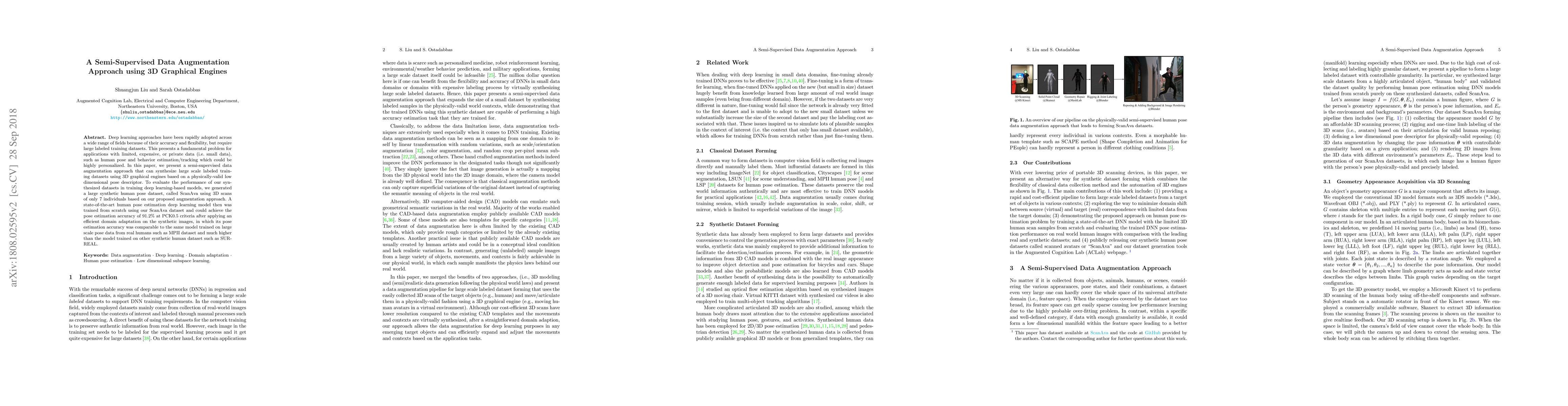 Deep learning approaches have been rapidly adopted across a wide range of fields because of their accuracy and flexibility, but require large labeled training datasets. This presents a fundamental problem for applications with limited, expensive, or private data (i.e. small data), such as human pose and behavior estimation/tracking which could be highly personalized. In this paper, we present a semi-supervised data augmentation approach that can synthesize large scale labeled training datasets using 3D graphical engines based on a physically-valid low dimensional pose descriptor. To evaluate the performance of our synthesized datasets in training deep learning-based models, we generated a large synthetic human pose dataset, called ScanAva using 3D scans of only 7 individuals based on our proposed augmentation approach. A state-of-the-art human pose estimation deep learning model then was trained from scratch using our ScanAva dataset and could achieve the pose estimation accuracy of 91.2% at PCK0.5 criteria after applying an efficient domain adaptation on the synthetic images, in which its pose estimation accuracy was comparable to the same model trained on large scale pose data from real humans such as MPII dataset and much higher than the model trained on other synthetic human dataset such as SURREAL.