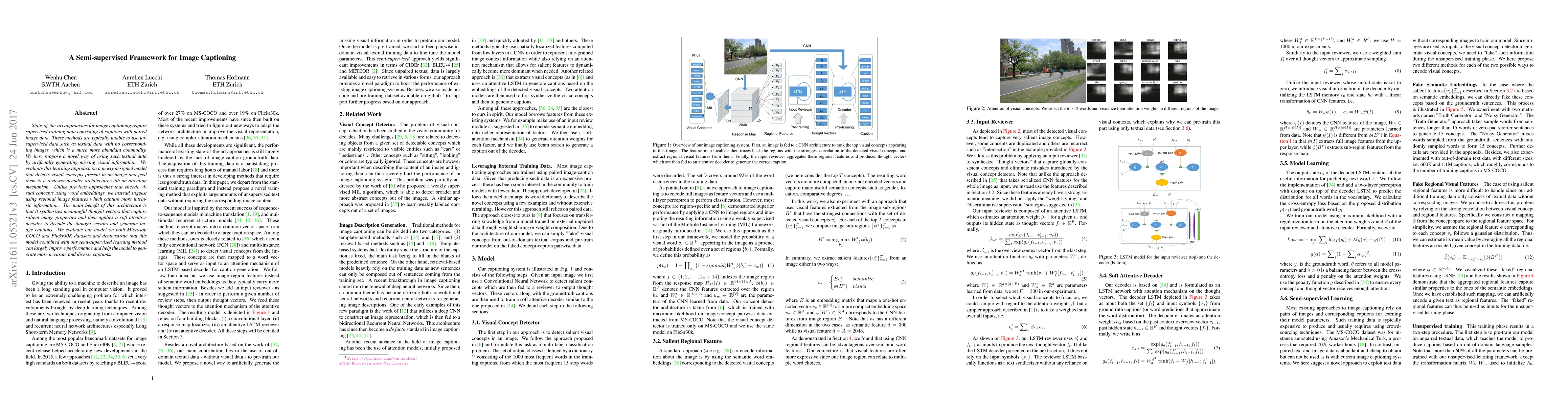 State-of-the-art approaches for image captioning require supervised training data consisting of captions with paired image data. These methods are typically unable to use unsupervised data such as textual data with no corresponding images, which is a much more abundant commodity. We here propose a novel way of using such textual data by artificially generating missing visual information. We evaluate this learning approach on a newly designed model that detects visual concepts present in an image and feed them to a reviewer-decoder architecture with an attention mechanism. Unlike previous approaches that encode visual concepts using word embeddings, we instead suggest using regional image features which capture more intrinsic information. The main benefit of this architecture is that it synthesizes meaningful thought vectors that capture salient image properties and then applies a soft attentive decoder to decode the thought vectors and generate image captions. We evaluate our model on both Microsoft COCO and Flickr30K datasets and demonstrate that this model combined with our semi-supervised learning method can largely improve performance and help the model to generate more accurate and diverse captions.