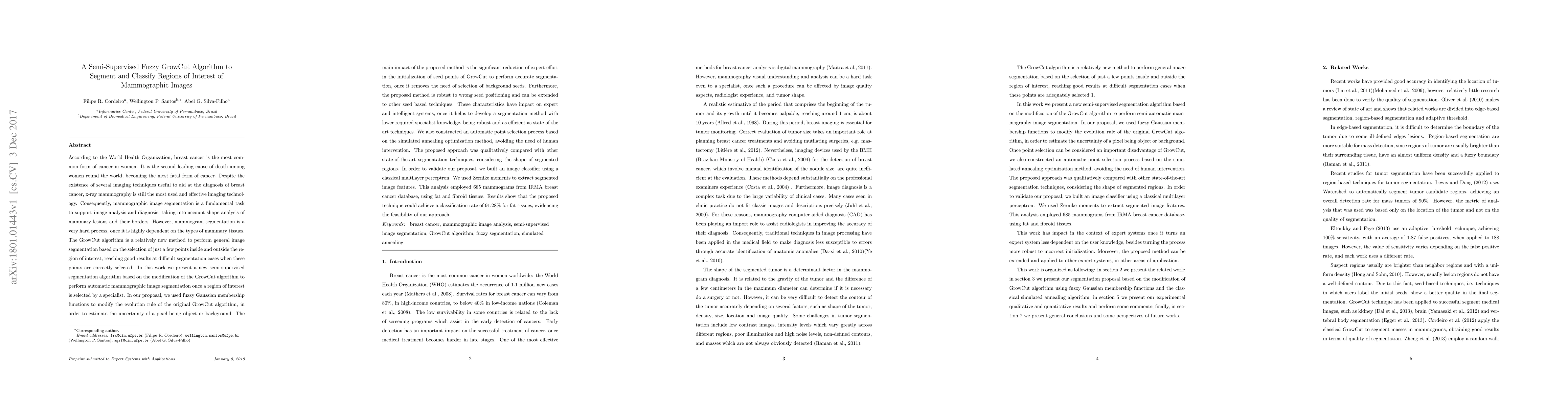 This paper presents a semi-supervised fuzzy GrowCut algorithm for automatic segmentation of mammographic images, reducing the need for expert-selected seed points. The method uses fuzzy Gaussian membership functions and simulated annealing for automatic point selection, achieving a 91.28% classification rate for fat tissues, demonstrating its effectiveness in reducing expert effort and improving segmentation accuracy.