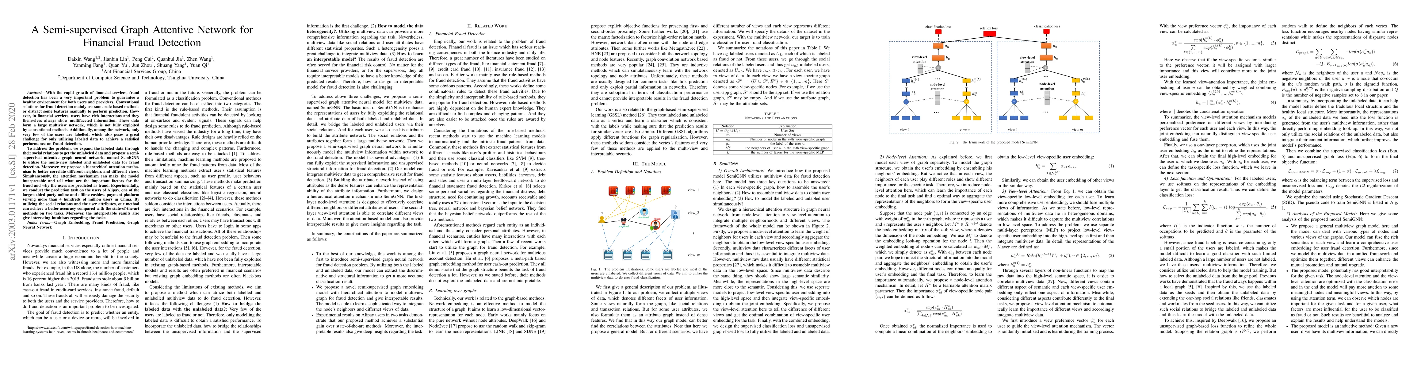This paper proposes a semi-supervised graph attentive network named SemiGNN for financial fraud detection, leveraging both labeled and unlabeled data through social relations. It employs a hierarchical attention mechanism to enhance interpretability and accuracy, achieving superior performance on Alipay's fraud detection tasks compared to state-of-the-art methods.