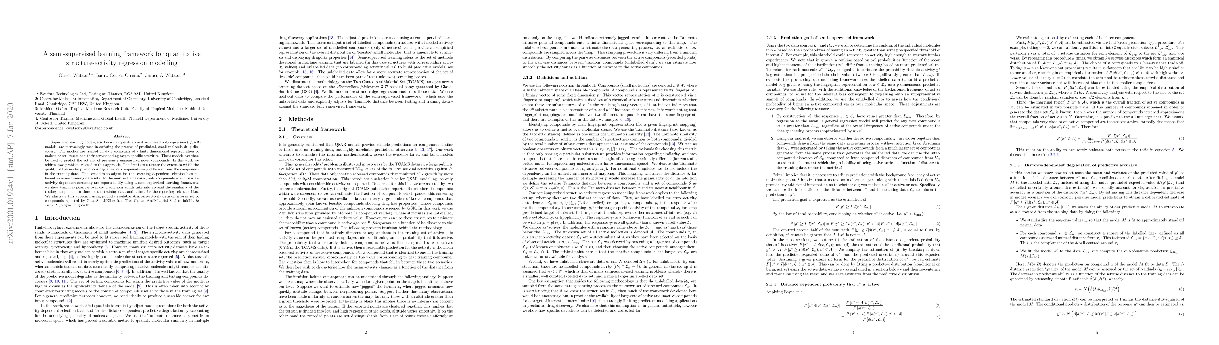 Supervised learning models, also known as quantitative structure-activity regression (QSAR) models, are increasingly used in assisting the process of preclinical, small molecule drug discovery. The models are trained on data consisting of a finite dimensional representation of molecular structures and their corresponding target specific activities. These models can then be used to predict the activity of previously unmeasured novel compounds. In this work we address two problems related to this approach. The first is to estimate the extent to which the quality of the model predictions degrades for compounds very different from the compounds in the training data. The second is to adjust for the screening dependent selection bias inherent in many training data sets. In the most extreme cases, only compounds which pass an activity-dependent screening are reported. By using a semi-supervised learning framework, we show that it is possible to make predictions which take into account the similarity of the testing compounds to those in the training data and adjust for the reporting selection bias. We illustrate this approach using publicly available structure-activity data on a large set of compounds reported by GlaxoSmithKline (the Tres Cantos AntiMalarial Set) to inhibit in vitro P. falciparum growth.