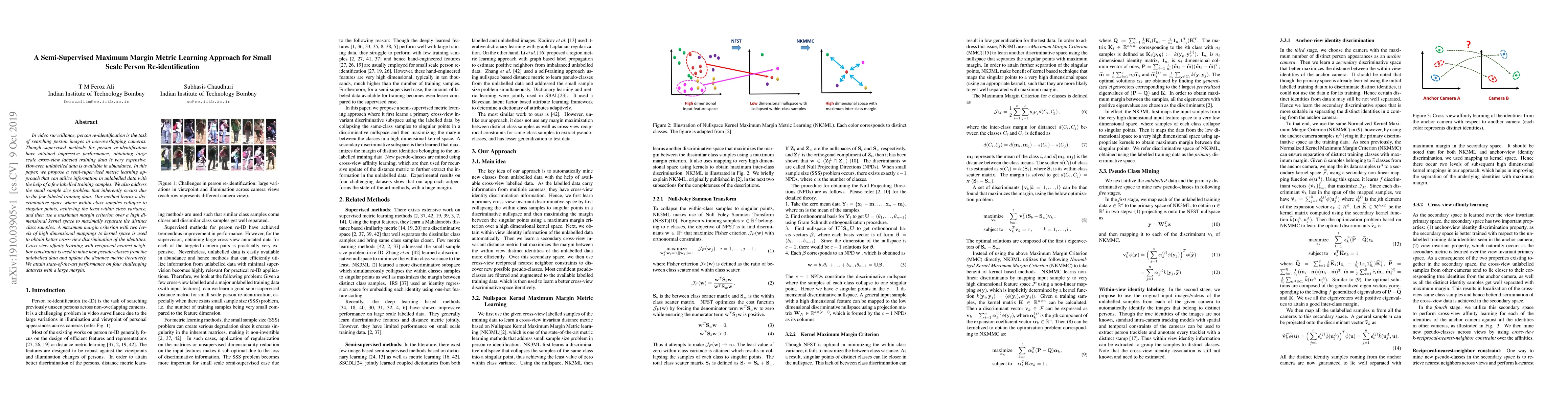 In video surveillance, person re-identification is the task of searching person images in non-overlapping cameras. Though supervised methods for person re-identification have attained impressive performance, obtaining large scale cross-view labeled training data is very expensive. However, unlabelled data is available in abundance. In this paper, we propose a semi-supervised metric learning approach that can utilize information in unlabelled data with the help of a few labelled training samples. We also address the small sample size problem that inherently occurs due to the few labeled training data. Our method learns a discriminative space where within class samples collapse to singular points, achieving the least within class variance, and then use a maximum margin criterion over a high dimensional kernel space to maximally separate the distinct class samples. A maximum margin criterion with two levels of high dimensional mappings to kernel space is used to obtain better cross-view discrimination of the identities. Cross-view affinity learning with reciprocal nearest neighbor constraints is used to mine new pseudo-classes from the unlabelled data and update the distance metric iteratively. We attain state-of-the-art performance on four challenging datasets with a large margin.