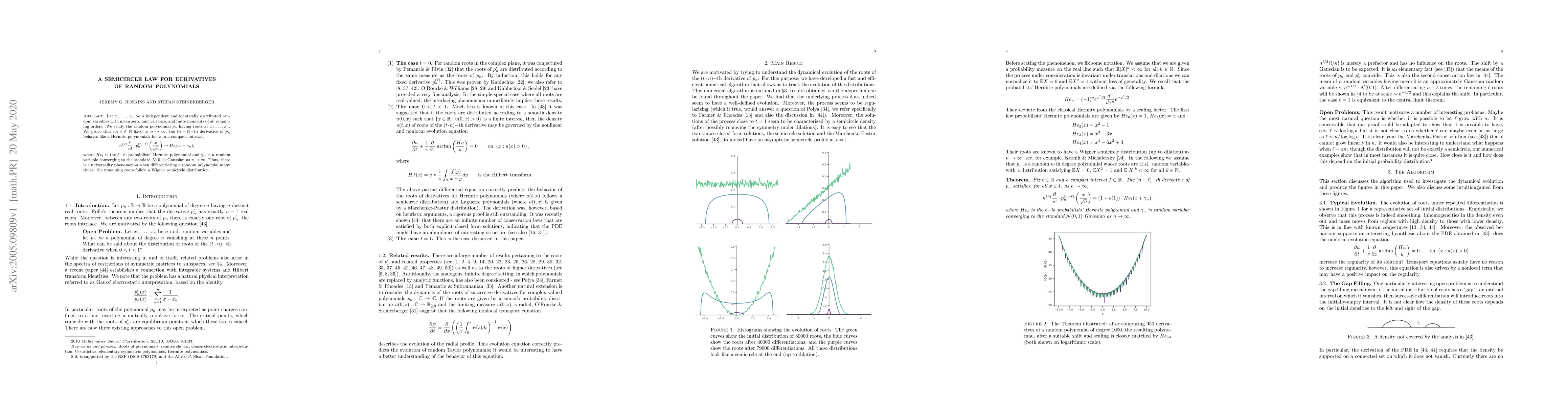 Let $x_1, \dots, x_n$ be $n$ independent and identically distributed random variables with mean zero, unit variance, and finite moments of all remaining orders. We study the random polynomial $p_n$ having roots at $x_1, \dots, x_n$. We prove that for $\ell \in \mathbb{N}$ fixed as $n \rightarrow \infty$, the $(n-\ell)-$th derivative of $p_n^{}$ behaves like a Hermite polynomial: for $x$ in a compact interval,$${n^{\ell/2}} \frac{\ell!}{n!} \cdot p_n^{(n-\ell)}\left( \frac{x}{\sqrt{n}}\right) \rightarrow He_{\ell}(x + \gamma_n),$$ where $He_{\ell}$ is the $\ell-$th probabilists' Hermite polynomial and $\gamma_n$ is a random variable converging to the standard $\mathcal{N}(0,1)$ Gaussian as $n \rightarrow \infty$. Thus, there is a universality phenomenon when differentiating a random polynomial many times: the remaining roots follow a Wigner semicircle distribution.