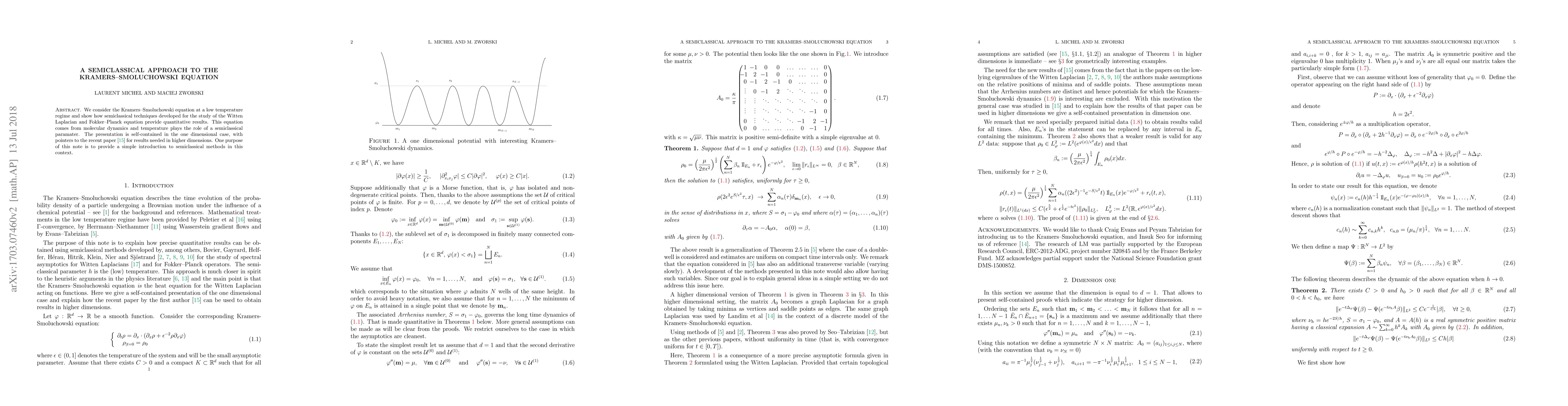 This paper explores the Kramers-Smoluchowski equation in low-temperature regimes using semiclassical techniques, providing quantitative results through methods developed for the Witten Laplacian and Fokker-Planck equation. The study focuses on a one-dimensional case with references to higher-dimensional results in a cited paper.