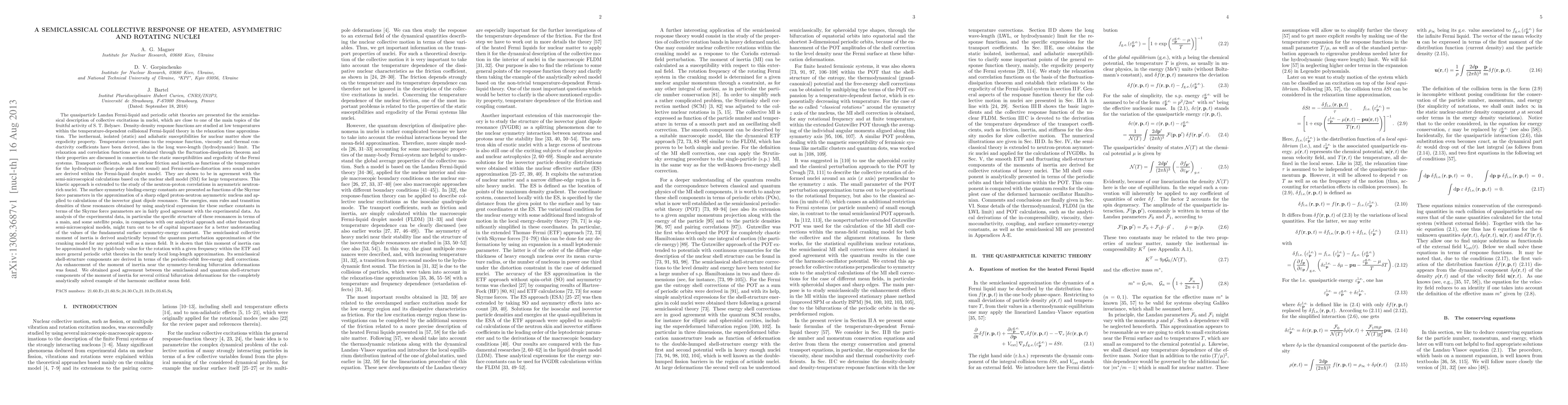 This paper presents semiclassical theories for collective excitations in heated, asymmetric, and rotating nuclei, deriving transport coefficients and analyzing isovector dipole resonances. The study aligns with experimental data and provides insights into the surface symmetry energy constant and the semiclassical collective moment of inertia.
