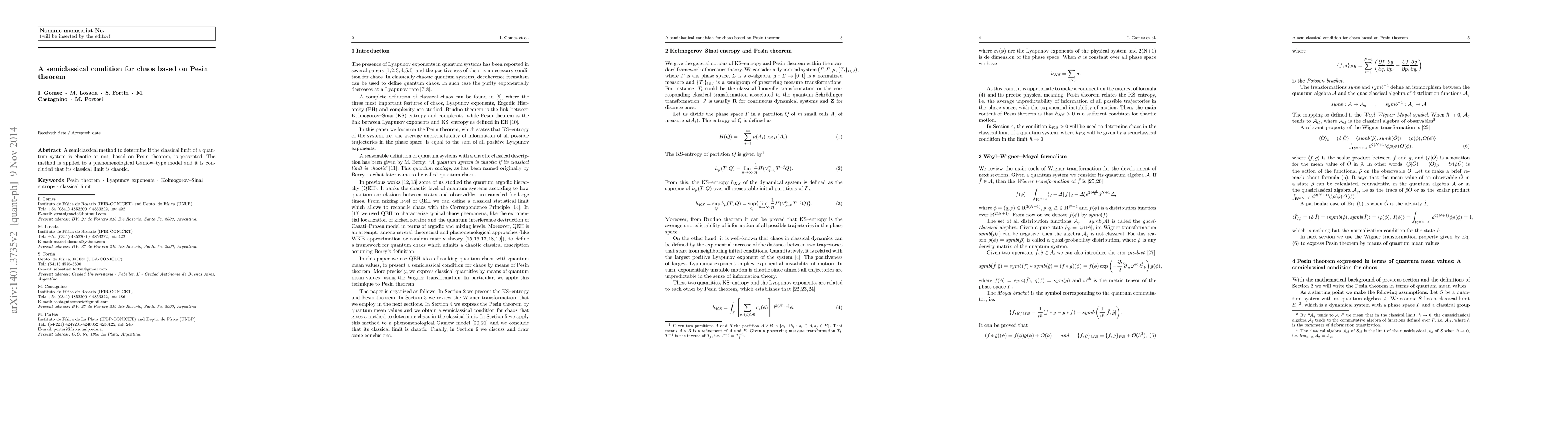A new method is presented to determine if a quantum system's classical limit is chaotic, based on Pesin theorem, which concludes that a specific model's classical limit is indeed chaotic.