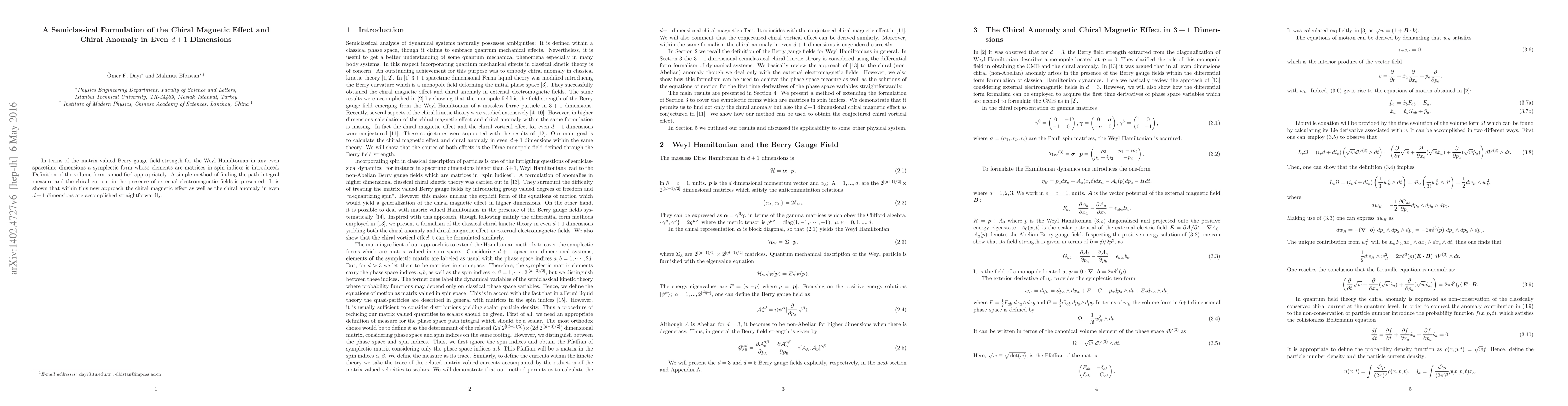 This paper introduces a semiclassical formulation for the chiral magnetic effect and chiral anomaly in even d+1 dimensions using a symplectic form based on the matrix valued Berry gauge field strength for the Weyl Hamiltonian. The method provides a straightforward approach to these phenomena.