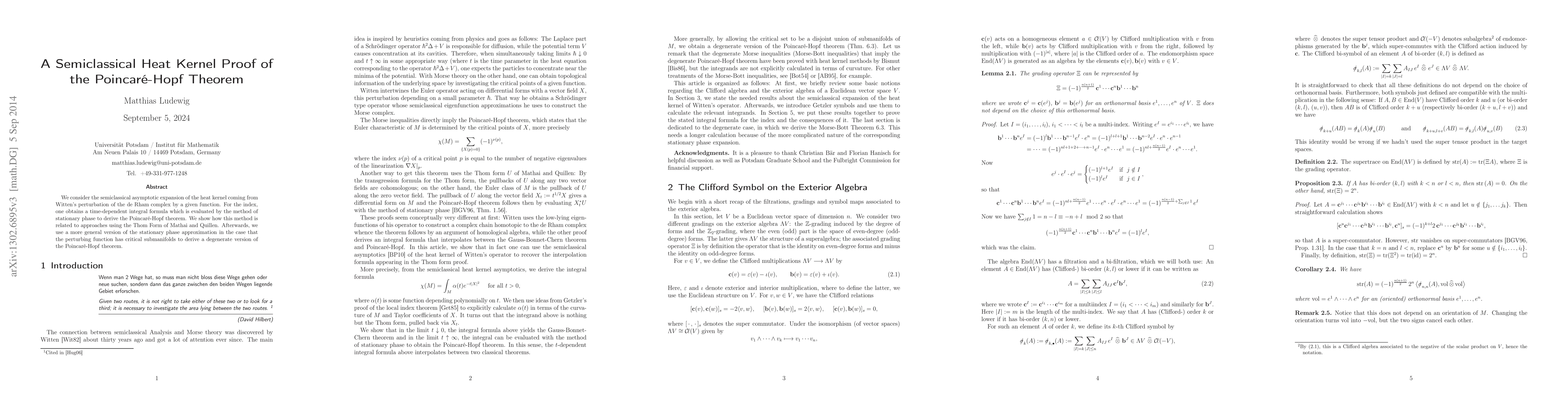 This paper uses semiclassical heat kernel techniques to prove the Poincaré-Hopf theorem and its degenerate versions, revealing connections between the semiclassical asymptotics of the Witten heat kernel and the Thom form approaches by Mathai and Quillen.