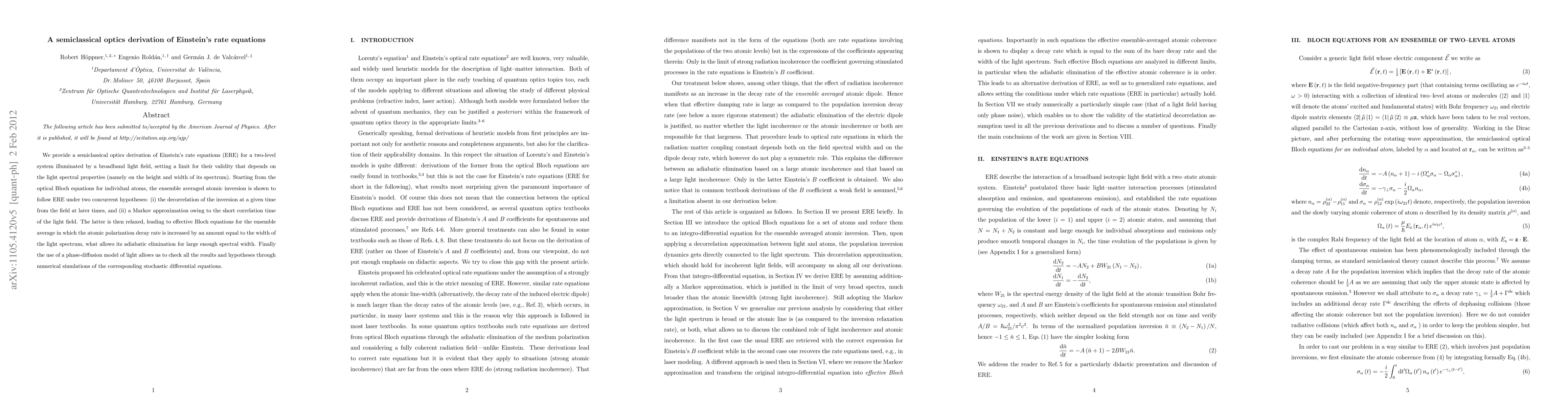 This paper derives Einstein's rate equations for a two-level system using semiclassical optics, establishing their validity under conditions dependent on the light spectrum's height and width. The derivation relaxes Markov assumptions, showing that the atomic polarization decay rate increases with the light spectrum width, enabling its elimination for broad spectra.