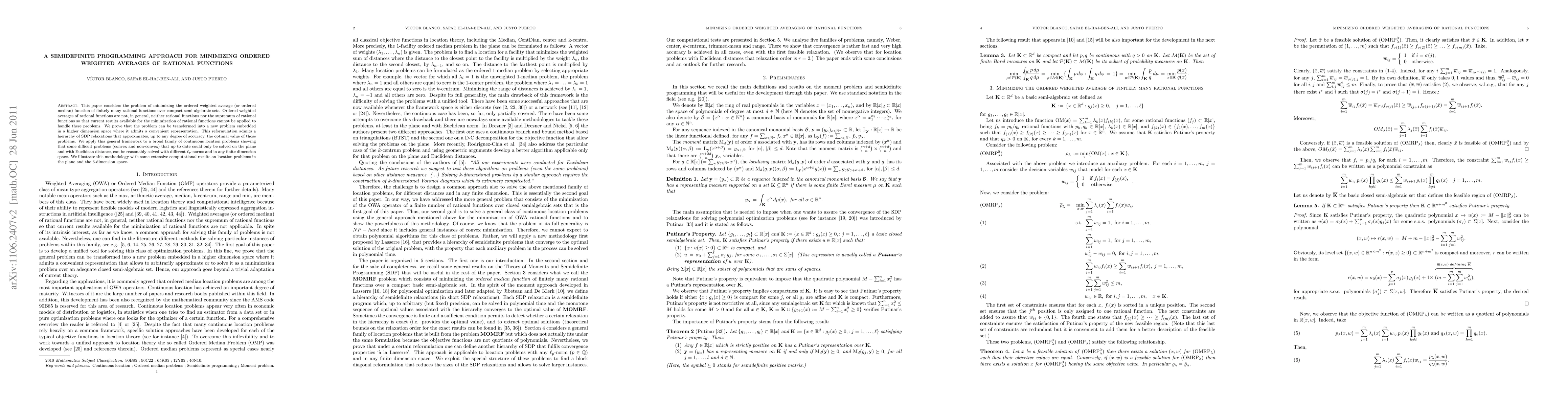 This paper proposes a semidefinite programming approach to minimize ordered weighted averages of rational functions over semi-algebraic sets, transforming the problem into a higher-dimensional space for SDP relaxations. The method extends to various continuous location problems, enabling solutions with different $\ell_p$-norms beyond the plane.
