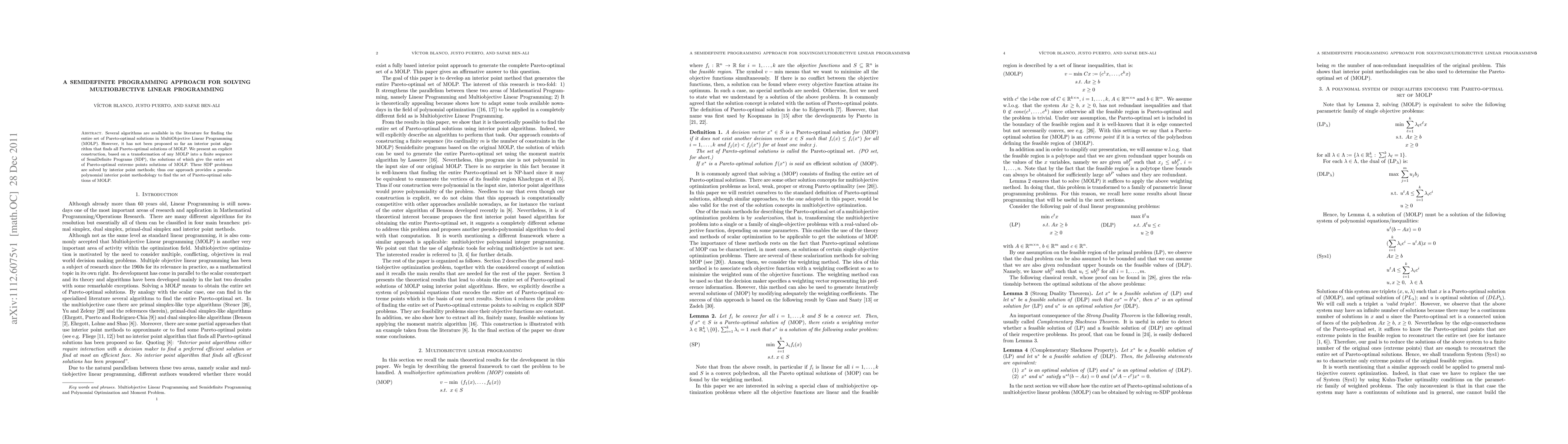 Researchers develop an algorithm to solve MultiObjective Linear Programming using semi-definite programming, offering a pseudo-polynomial interior point methodology for finding Pareto-optimal solutions.