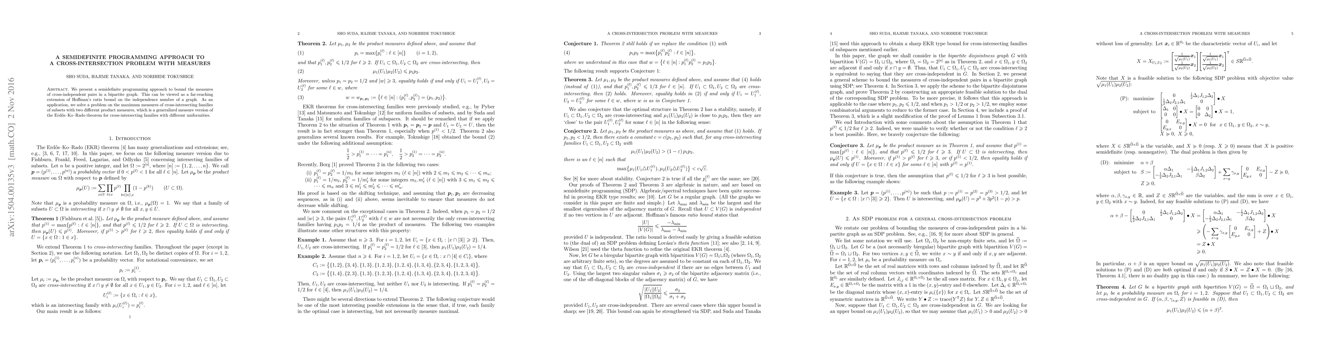 Summary: This paper introduces a semidefinite programming method to determine bounds on measures of cross-independent pairs in bipartite graphs, extending Hoffman's ratio bound. It also applies this approach to solve a generalized version of the Erdős-Ko-Rado theorem for cross-intersecting families with different product measures.
