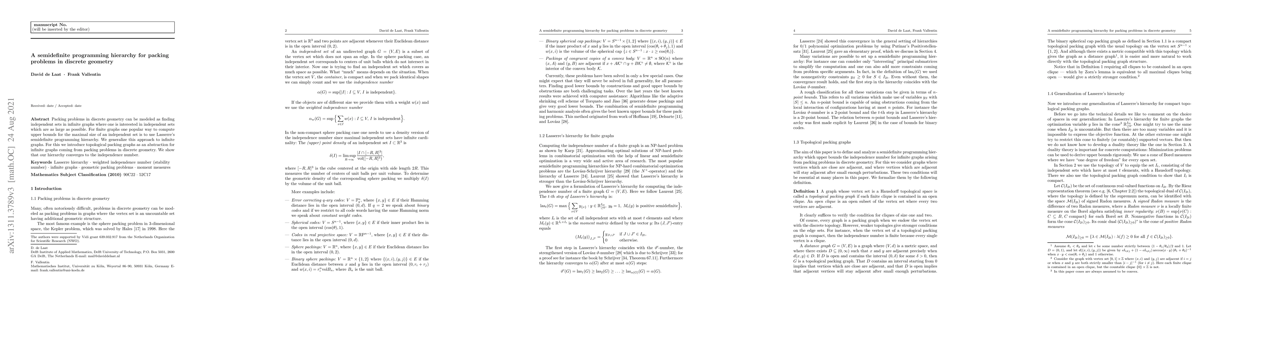 This paper generalizes Lasserre's semidefinite programming hierarchy to infinite graphs, introducing topological packing graphs for packing problems in discrete geometry. The proposed hierarchy converges to the independence number, providing a method for computing upper bounds for maximal independent set sizes in such problems.