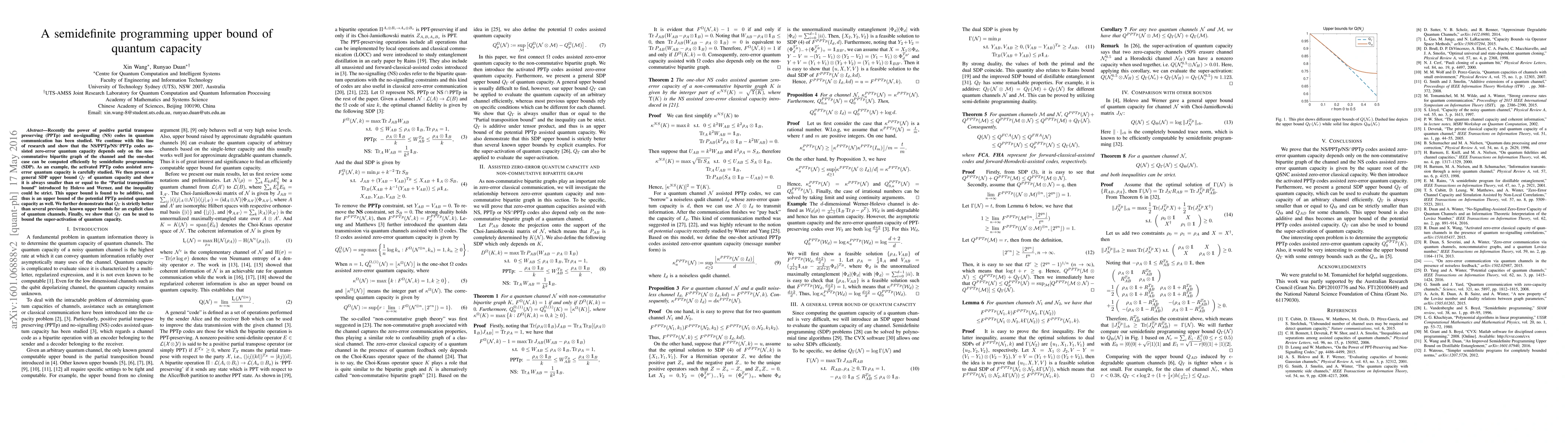 Recently the power of positive partial transpose preserving (PPTp) and no-signalling (NS) codes in quantum communication has been studied. We continue with this line of research and show that the NS/PPTp/NS$\cap$PPTp codes assisted zero-error quantum capacity depends only on the non-commutative bipartite graph of the channel and the one-shot case can be computed efficiently by semidefinite programming (SDP). As an example, the activated PPTp codes assisted zero-error quantum capacity is carefully studied. We then present a general SDP upper bound $Q_\Gamma$ of quantum capacity and show it is always smaller than or equal to the "Partial transposition bound" introduced by Holevo and Werner, and the inequality could be strict. This upper bound is found to be additive, and thus is an upper bound of the potential PPTp assisted quantum capacity as well. We further demonstrate that $Q_\Gamma$ is strictly better than several previously known upper bounds for an explicit class of quantum channels. Finally, we show that $Q_\Gamma$ can be used to bound the super-activation of quantum capacity.