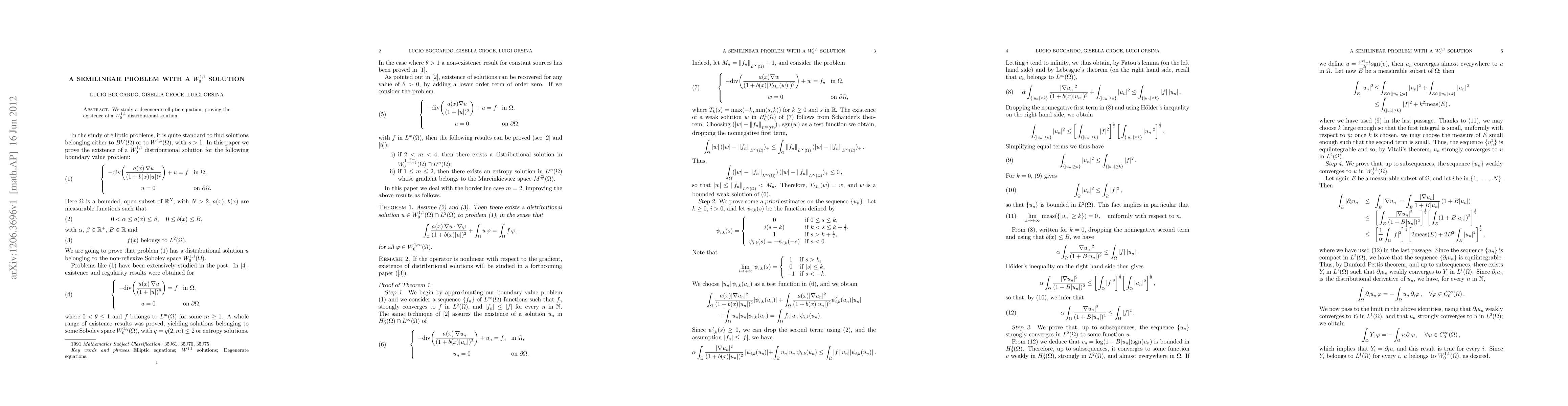 Summary: This paper investigates a degenerate elliptic equation and establishes the existence of a W^{1,1}_0 distributional solution, providing a foundational result for understanding such semilinear problems.