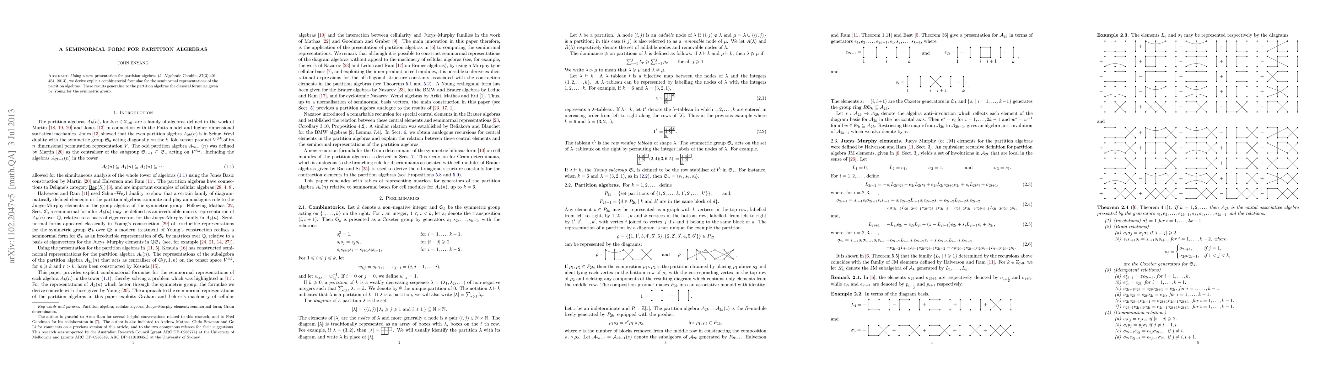 This paper introduces a new presentation for partition algebras and derives explicit combinatorial formulae for their seminormal representations, generalizing Young's classical results for the symmetric group. The findings provide a seminormal form for partition algebras, enhancing understanding of their structure.