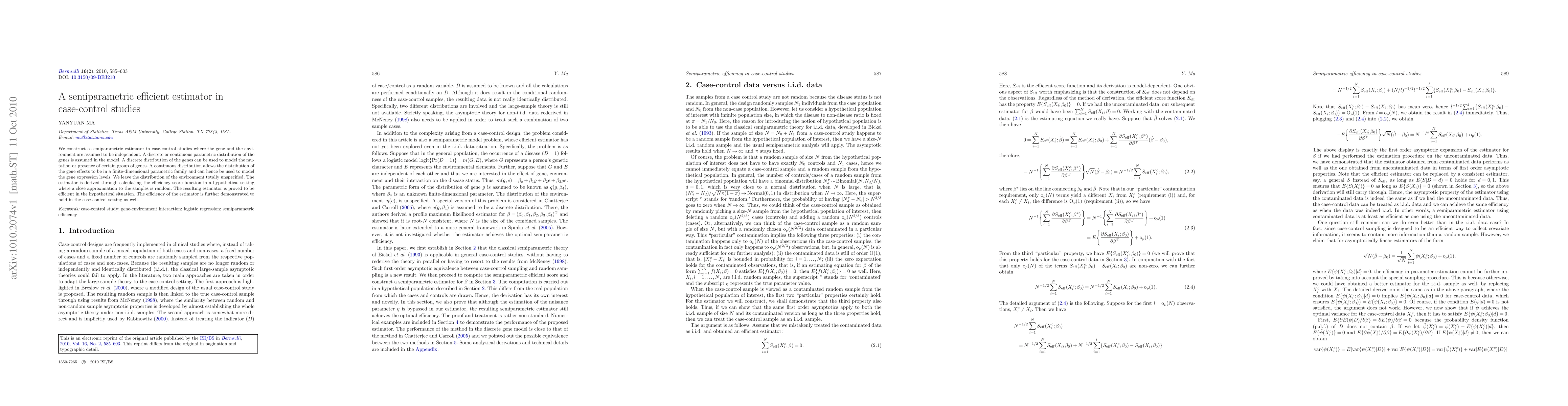 The paper constructs a semiparametric estimator in case-control studies assuming independence between genes and environment, with either a discrete or continuous parametric distribution for genes. The estimator is derived through an efficiency score function calculated with respect to a hypothetical random sample approximation.