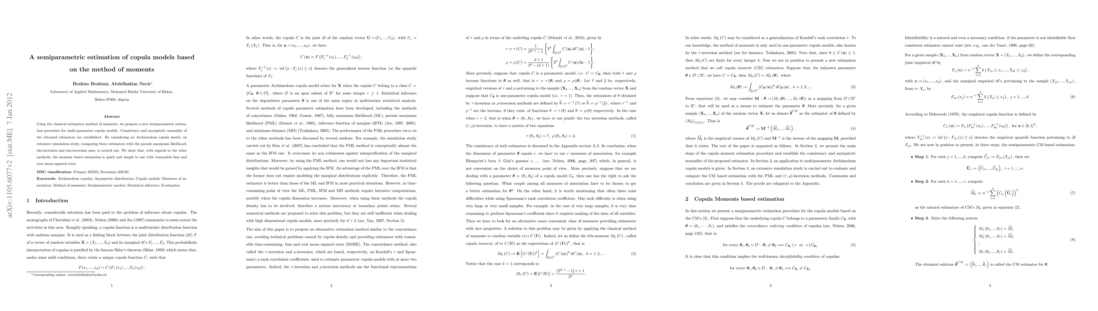 Summary: The paper proposes a semiparametric estimation method for multi-parameter copula models using the method of moments, demonstrating its consistency and asymptotic normality. Comparative simulation studies reveal that this method is efficient, easy to use, and offers reasonable accuracy compared to other existing methods.