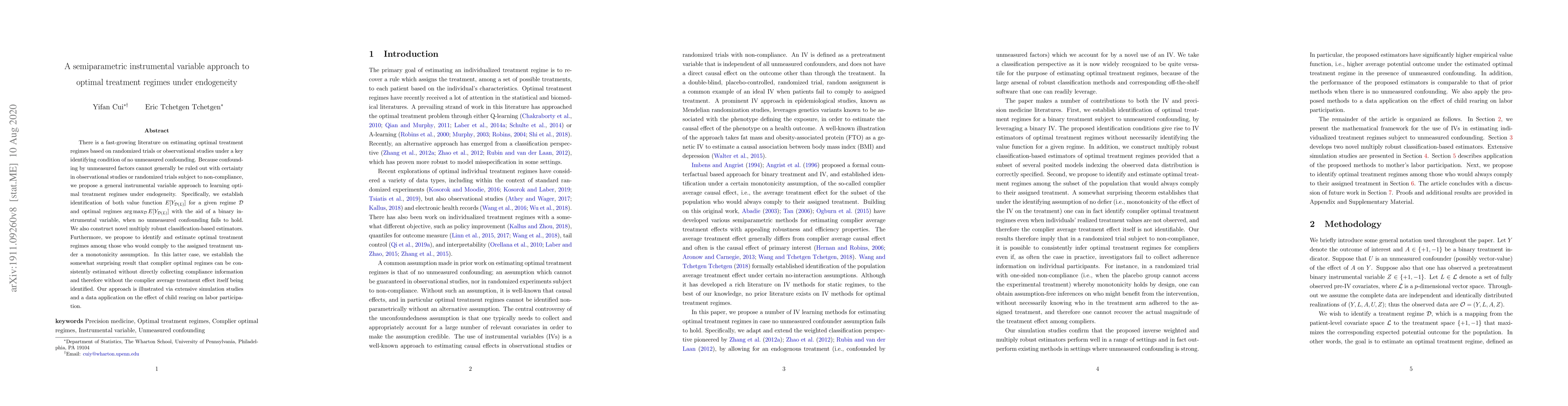 This paper proposes a semiparametric instrumental variable approach to estimate optimal treatment regimes under endogeneity, addressing unmeasured confounding in observational studies. It introduces novel estimators and demonstrates consistent estimation of complier optimal regimes without requiring compliance information.